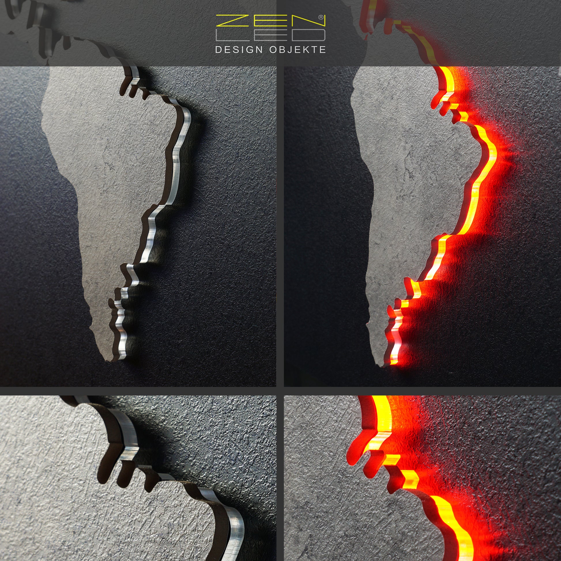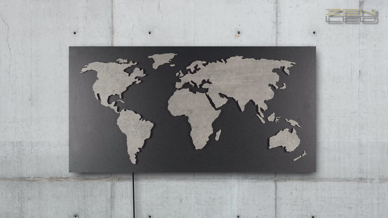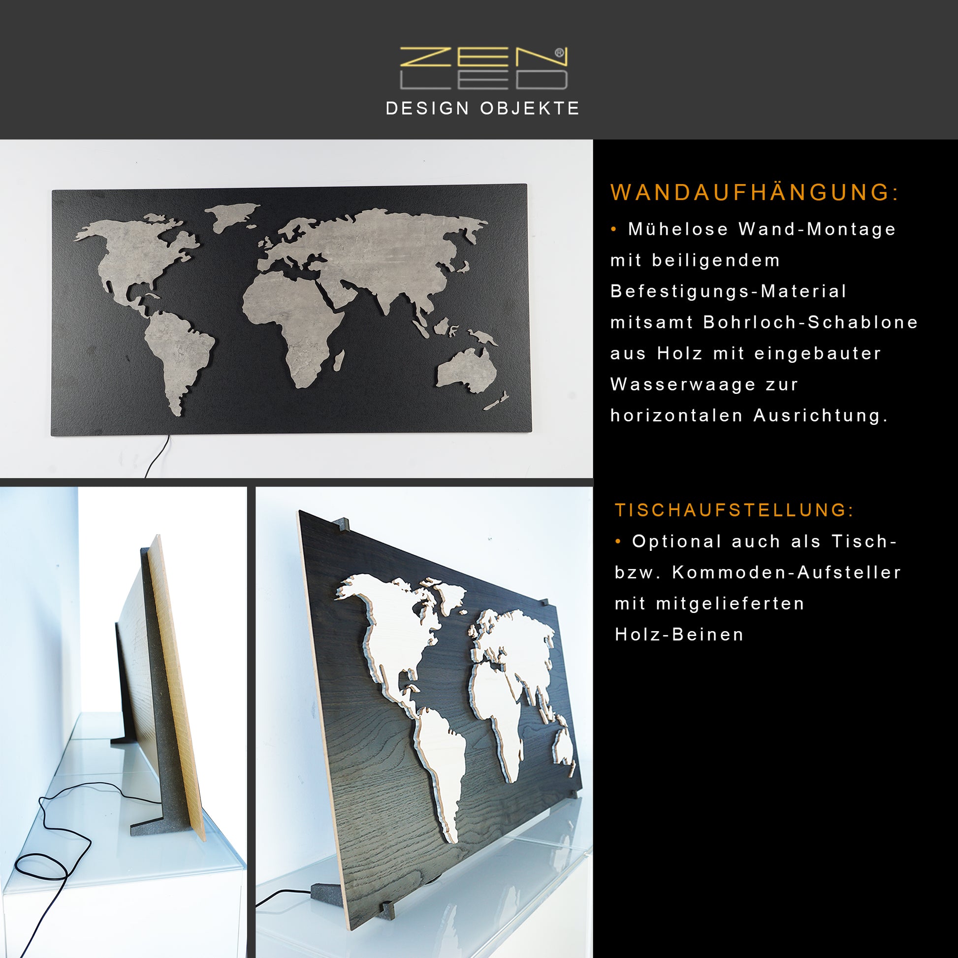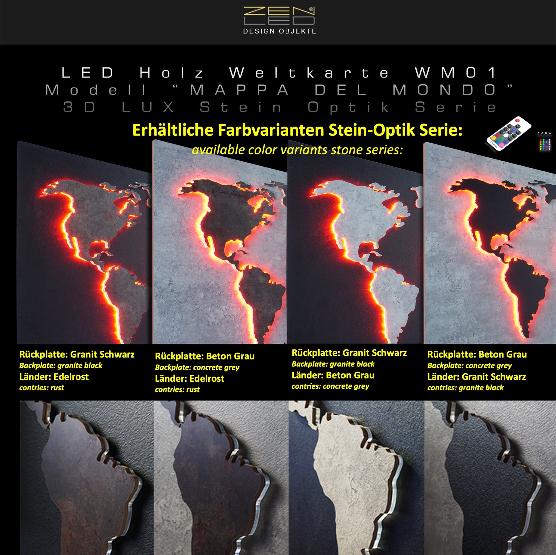 ABSOLUTER HINGUCKER - Beleuchtetes Wandbild in 110x57cm mit einer Holzfurnier-Grundplatte und Kontinenten/Länderausschnitten wahlweise in den Varianten-Serien mit NATURSTEIN-Optiken in Granit und Beton-Maserungen mit unterschiedlichen Farbkombinationen.