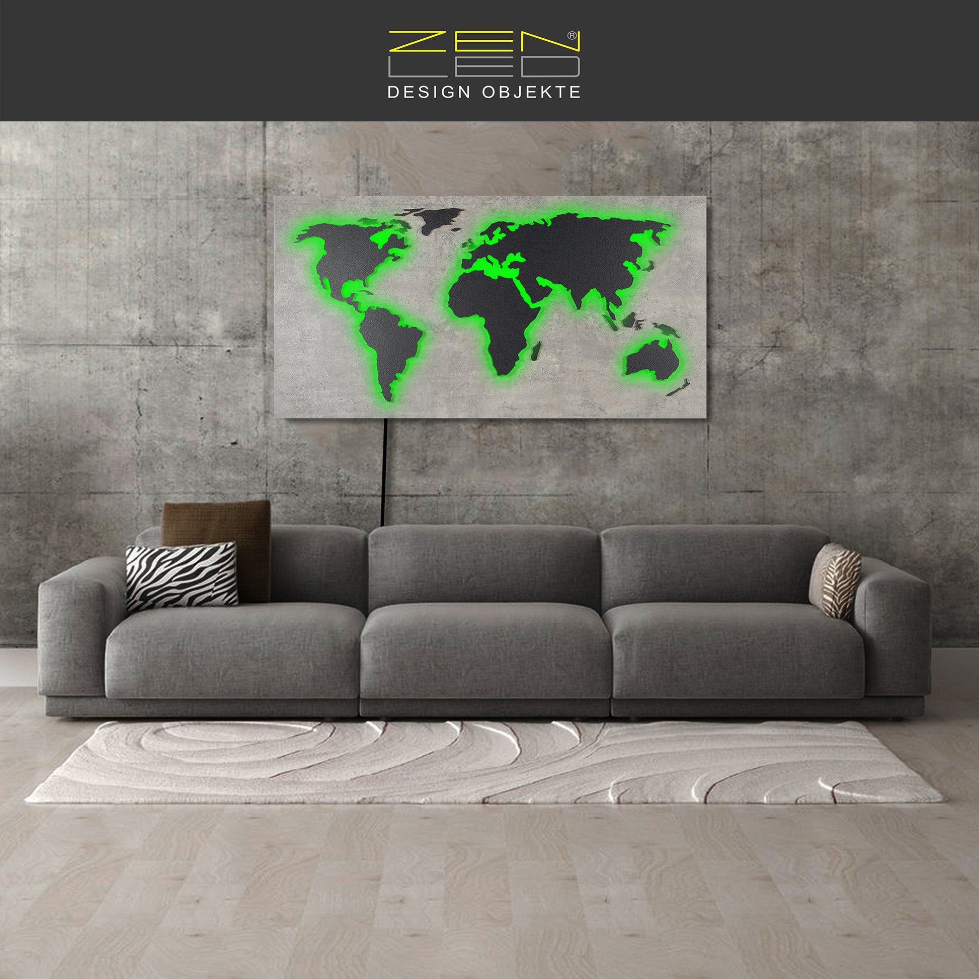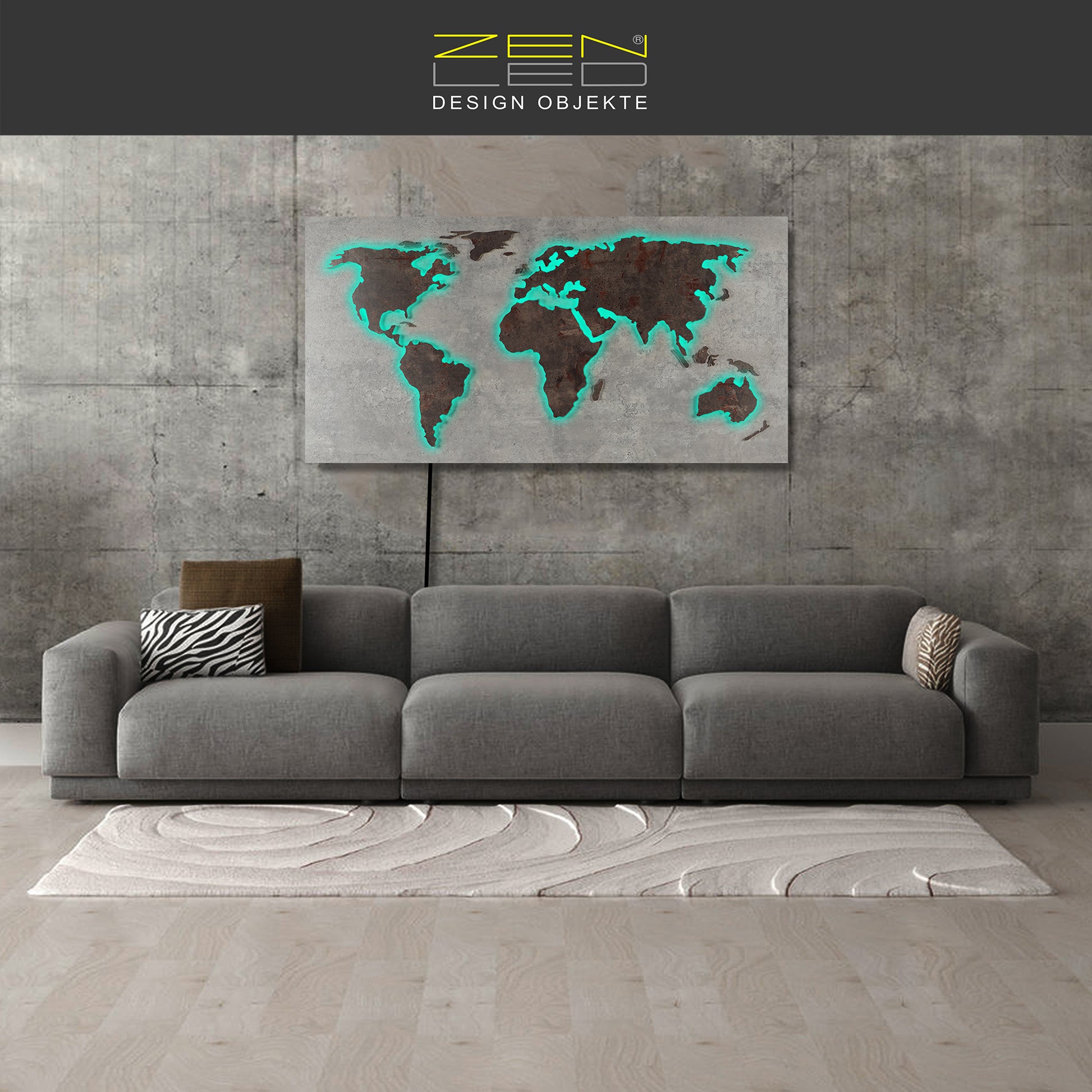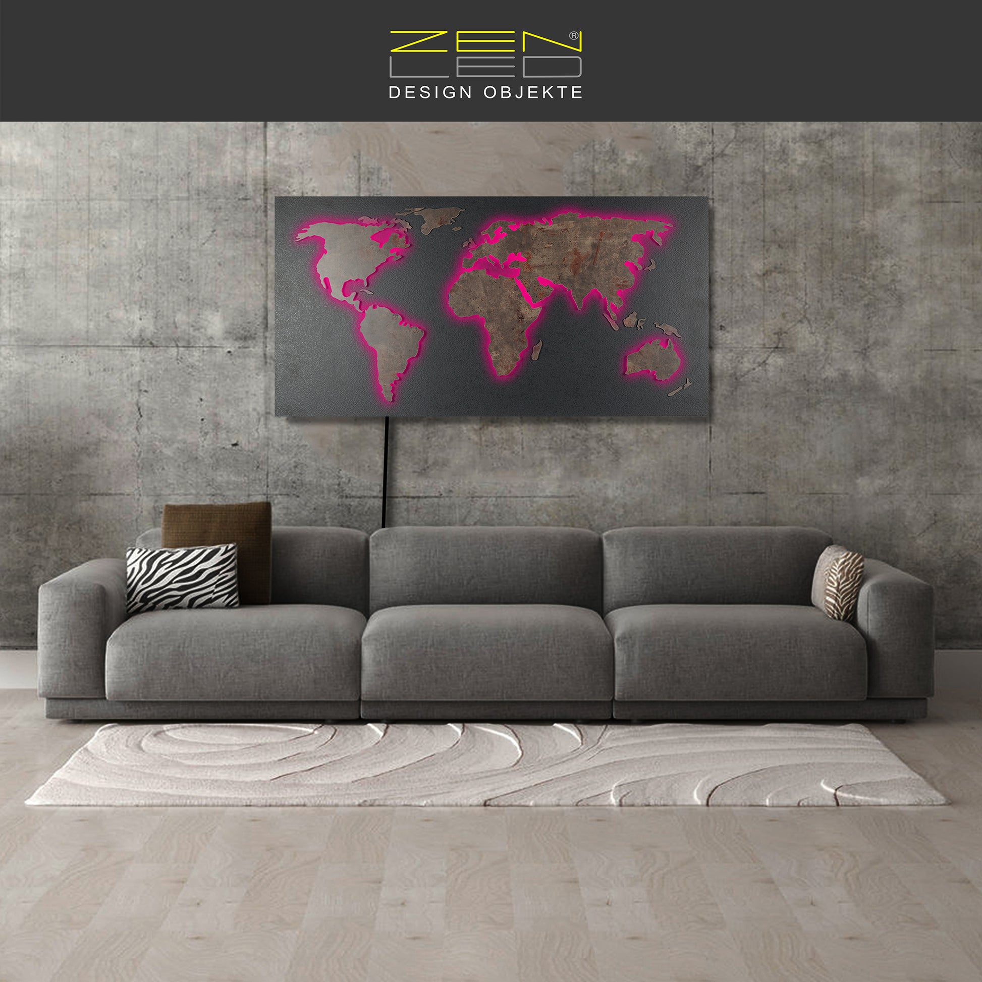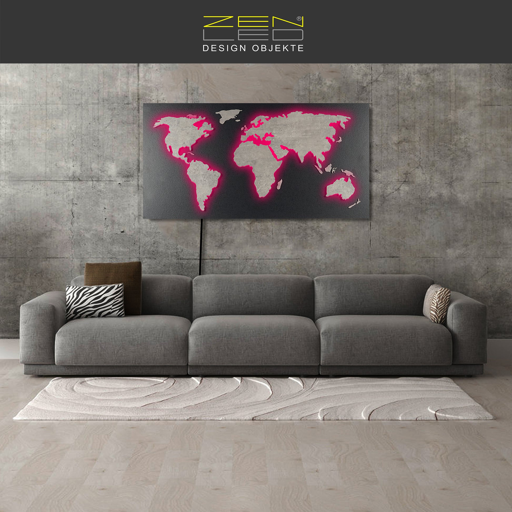 Die hinterleuchtete LED-Weltkarte in NATURSTEIN-Optiken werden im Wohnzimmer zum Deko Highlight.