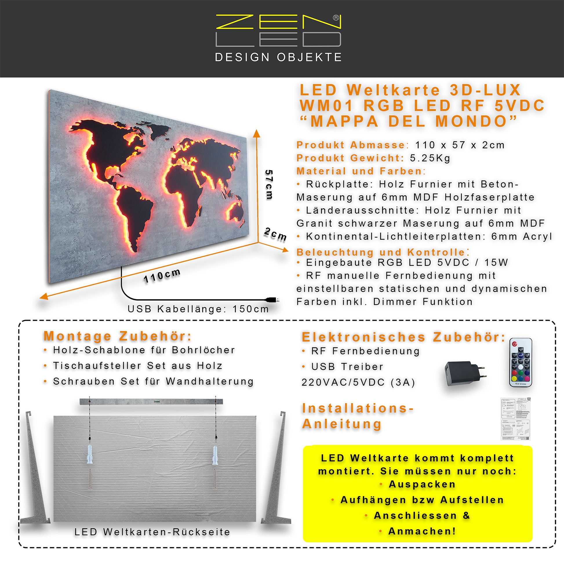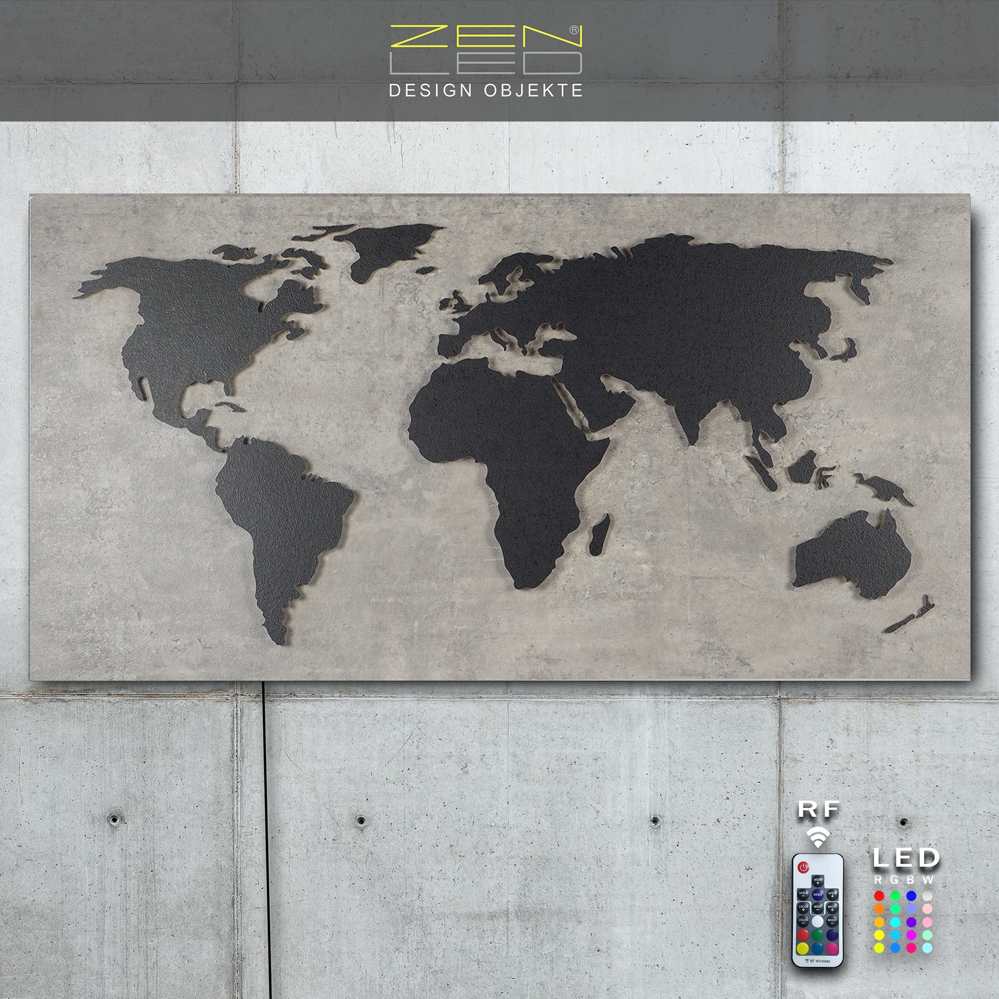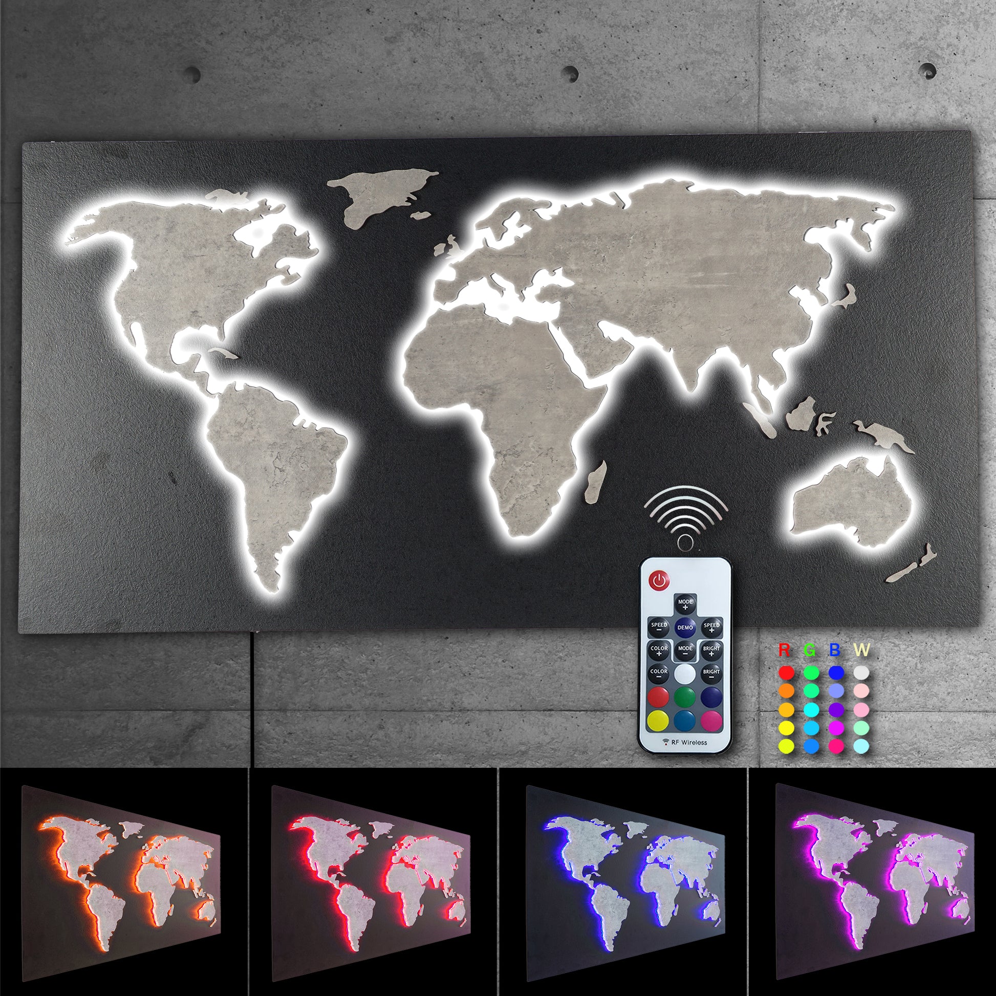 LED Designer LUX Weltkarte MAPPA DEL MONDO | STEIN-Optik Serie 110x57cm | Wanddeko und Leuchtbild mit 3D Effekt | bunte RGB Beleuchtung mit Fernbedienung | modern industriell Boho City-Chic