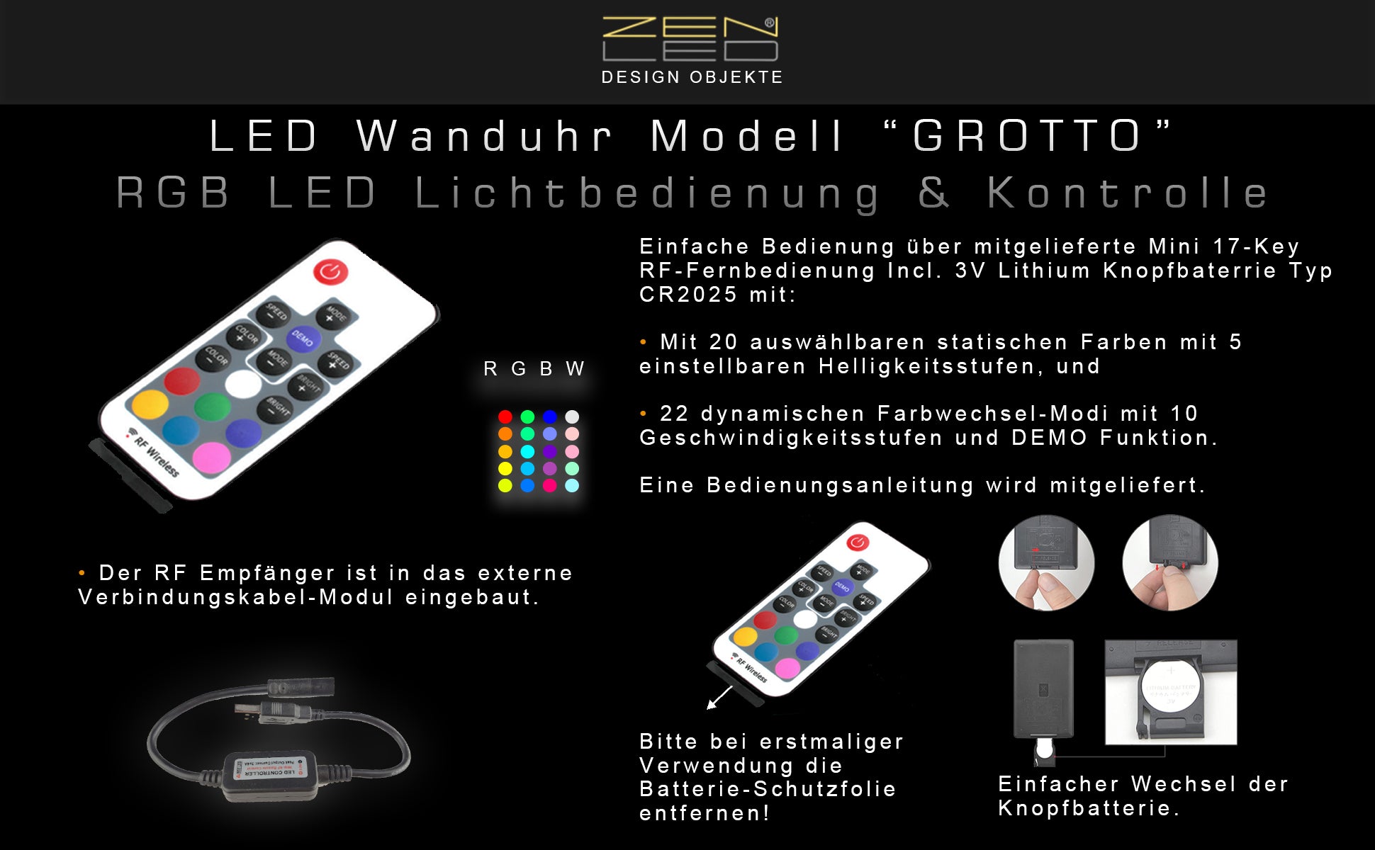 - Helligkeit und Farben regelbar mit Fernbedienung