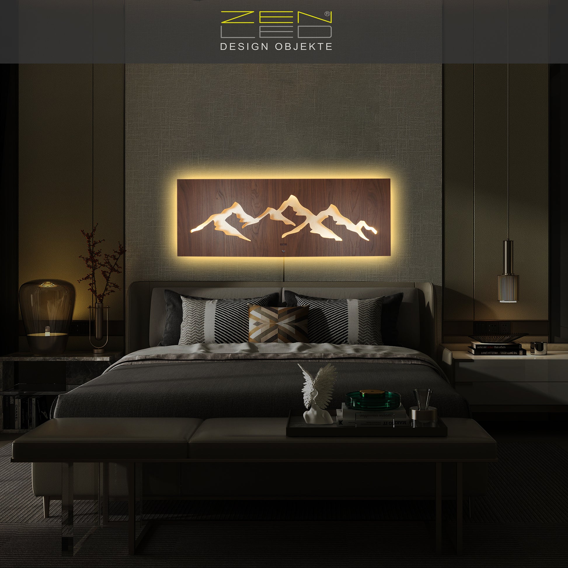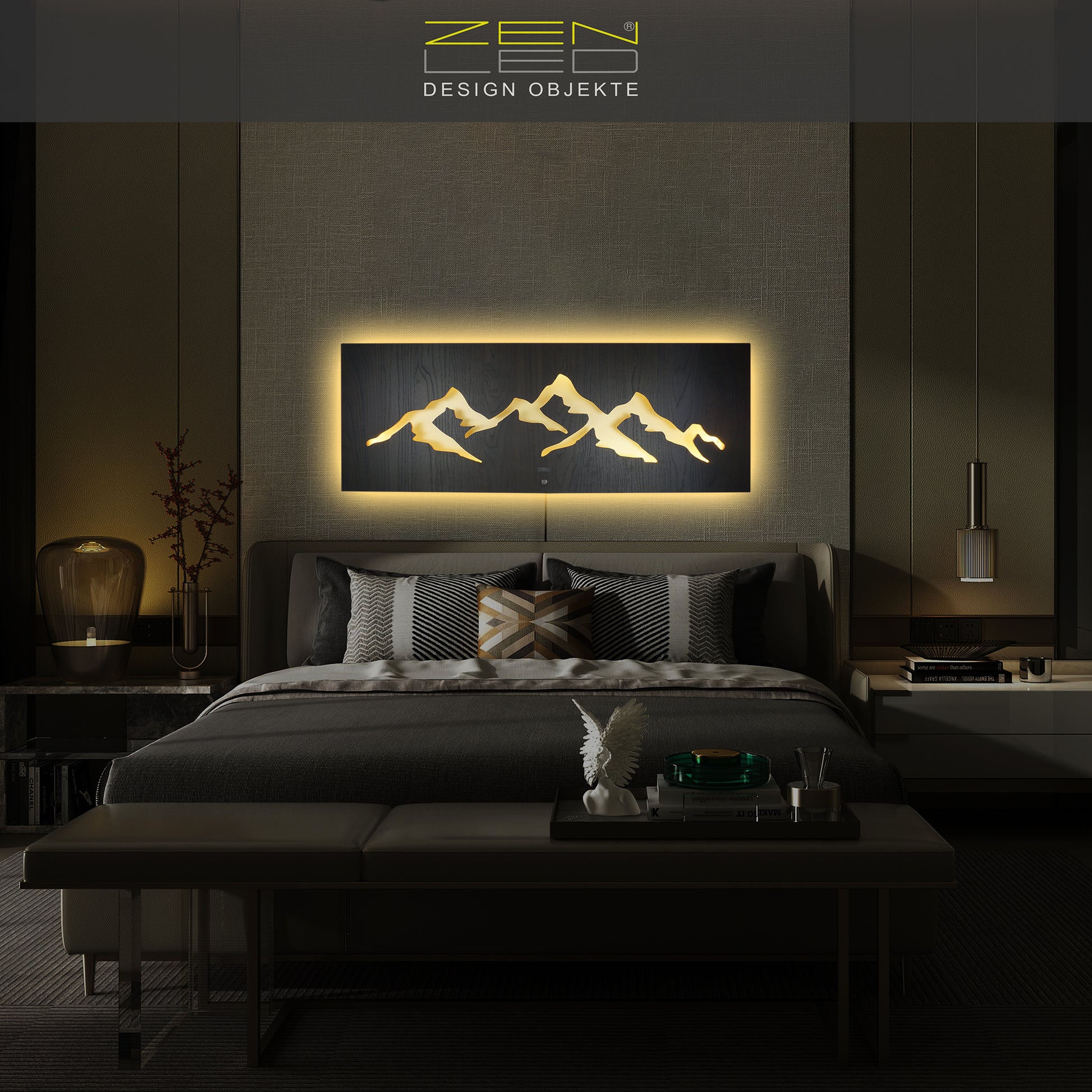EDLER BLICKFANG - Das warm-weiß hinterleuchtete Gebirgs-Motiv in natürlicher Holz Optik mit Metall Rückplatte wird zum eleganten Deko Highlight - ein beeindruckender Blickfang für Wohn-, Flur & Schlaf-Zimmer.