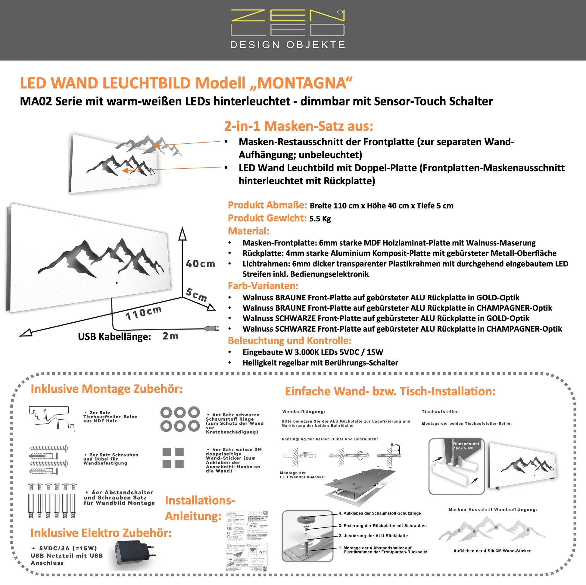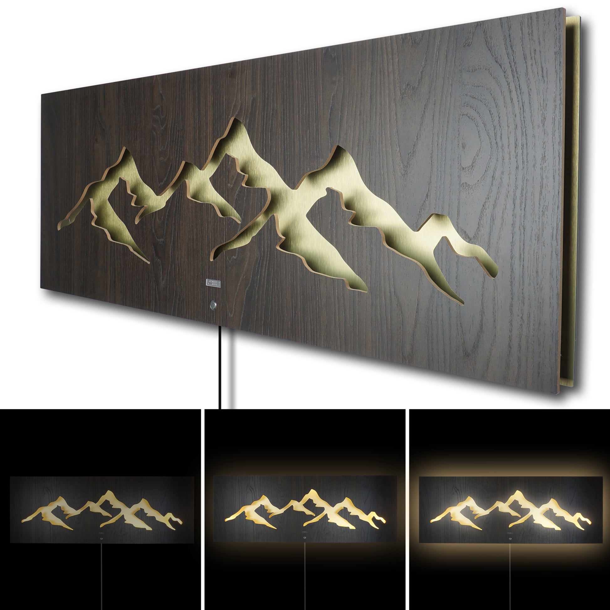 LED Wandbild MONTAGNA Berglandschaft | HOLZ-Optik mit Gold 110x40cm | Doppelplatte Holz und Metall mit 3D Lichteffekt | Wanddeko mit warm-weissen LEDs hinterleuchtet dimmbar | rustikal modern Landhaus