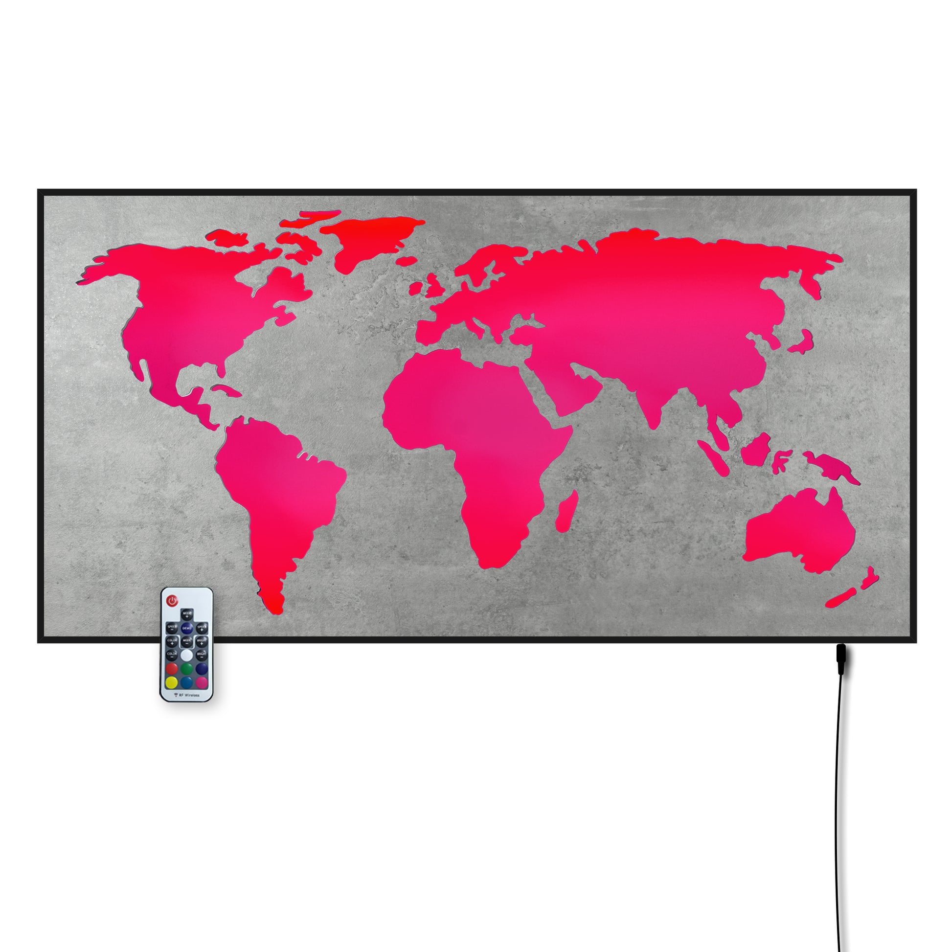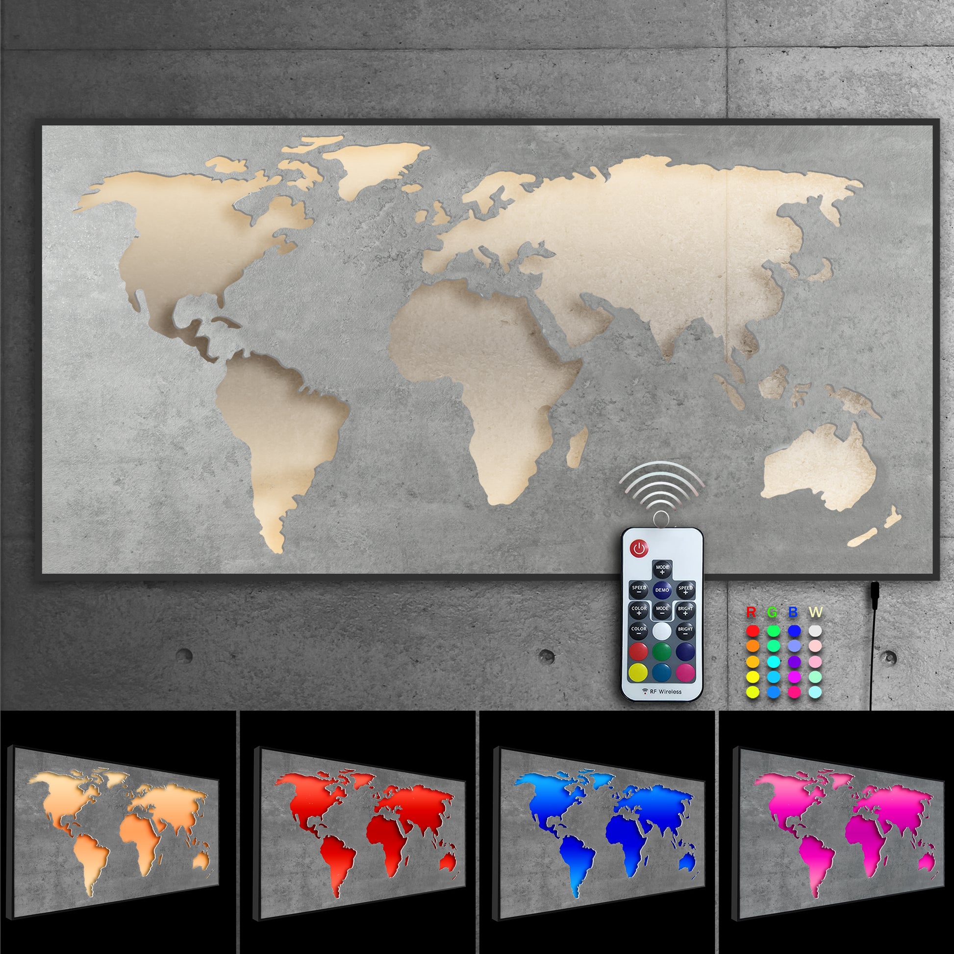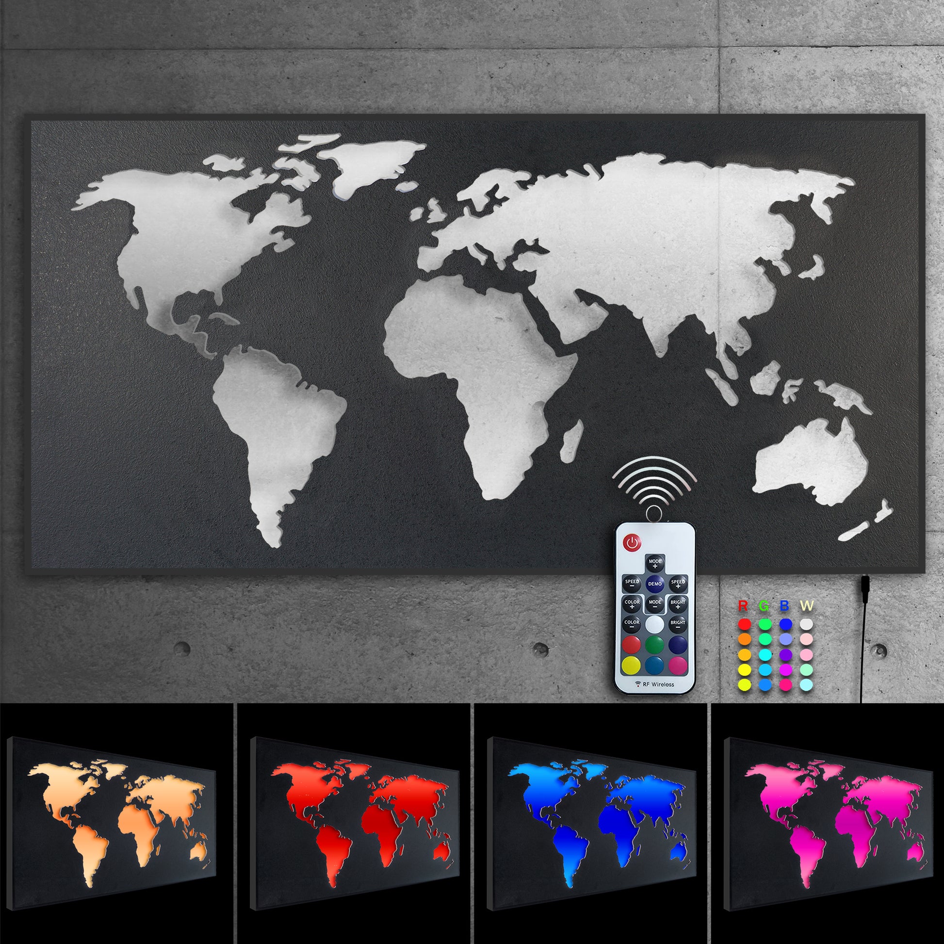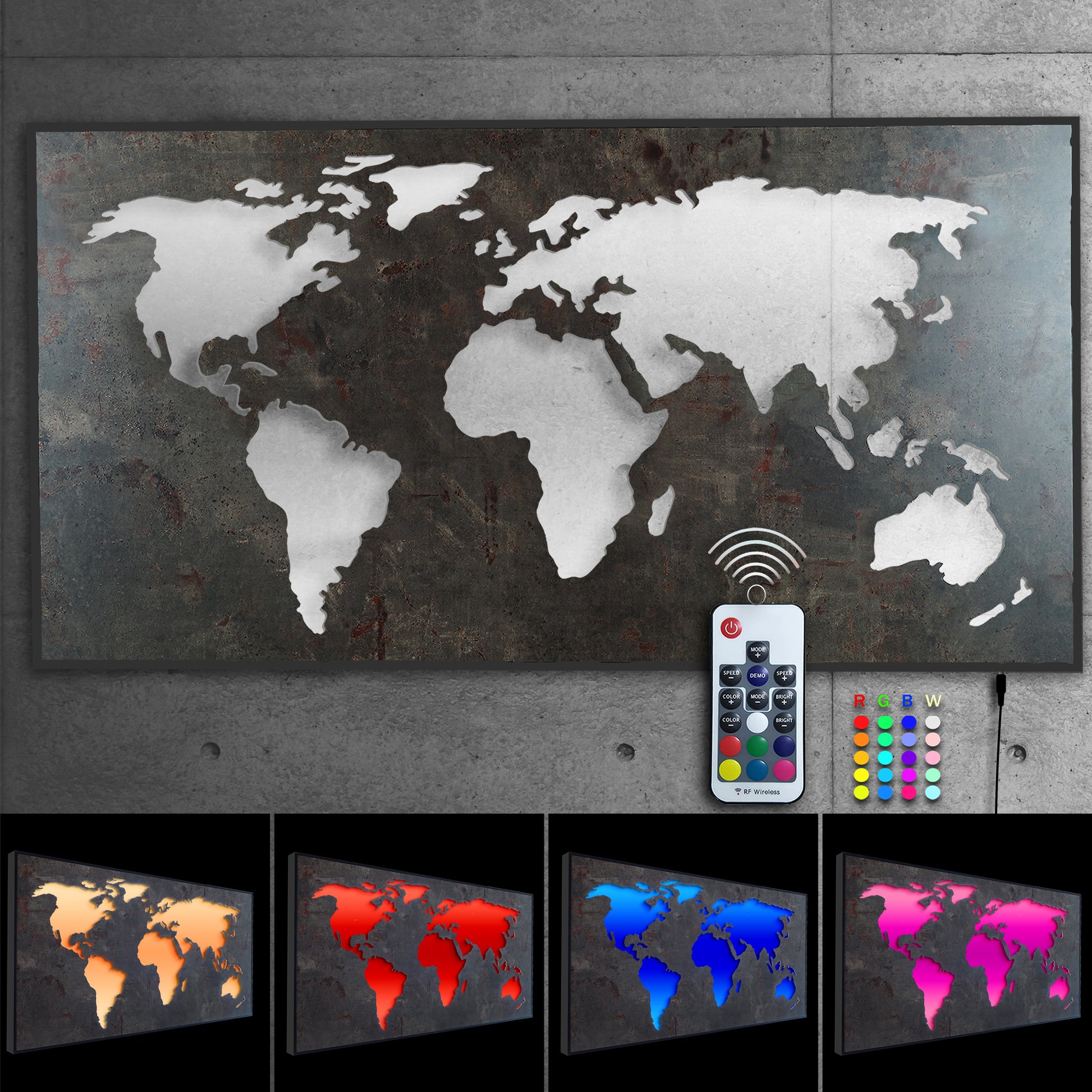 LED 3D Weltkarte MONDO MASCHERA mit ALU Rahmen | STEIN-Optik Serie 110x57cm | Wandobjekt und Leuchtbild mit 3D Effekt | RGB farbig hinterleuchtet mit Fernbedienung | modern industriell Boho City-Chic