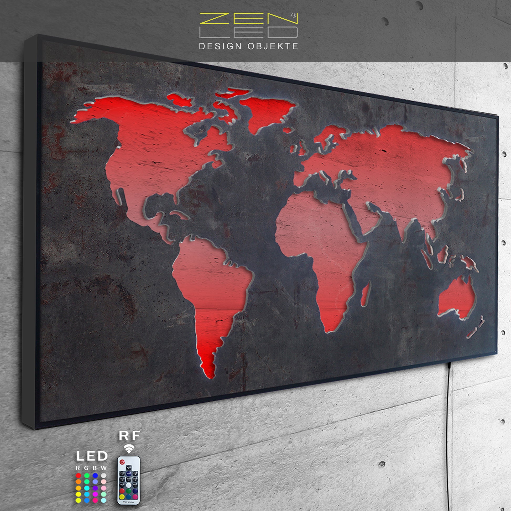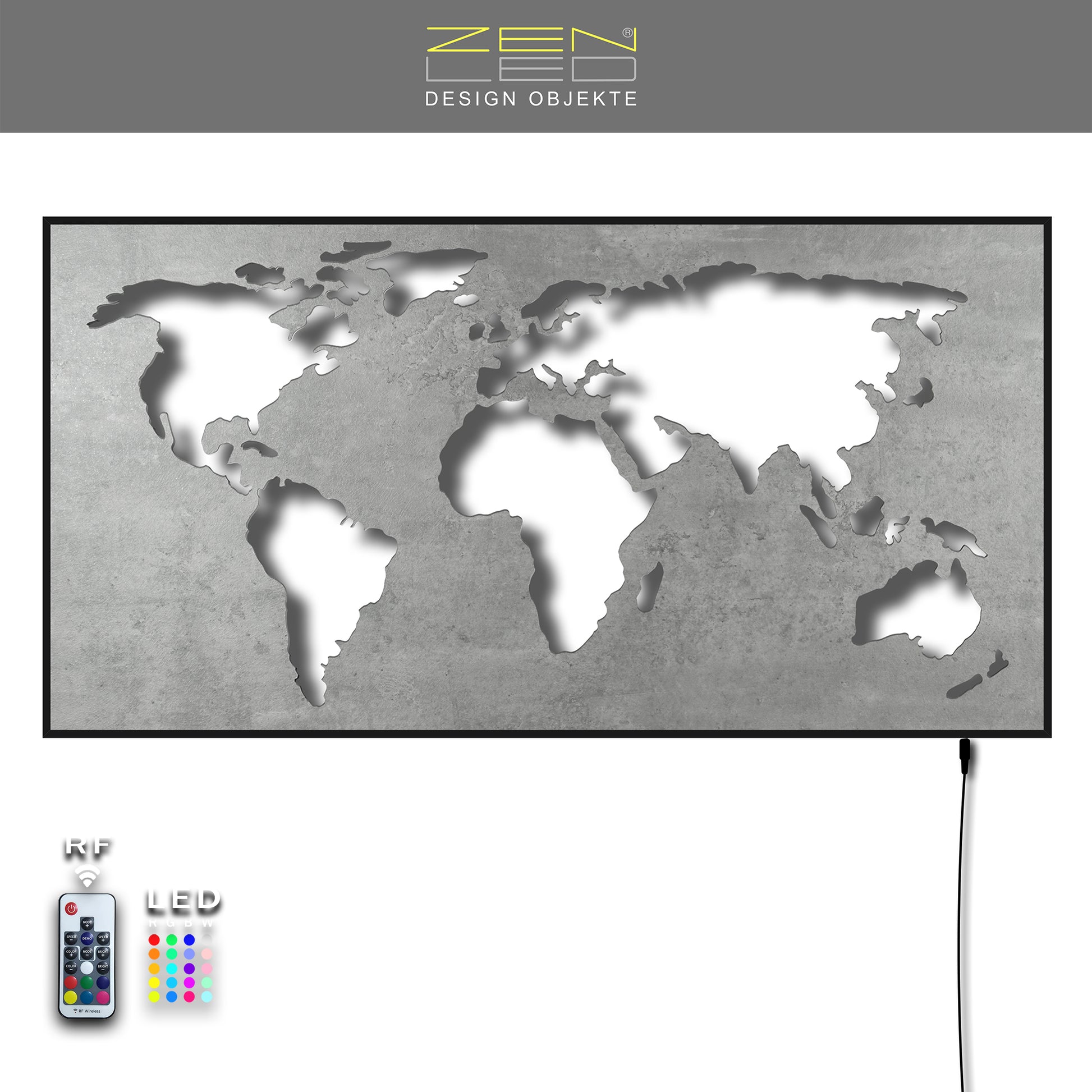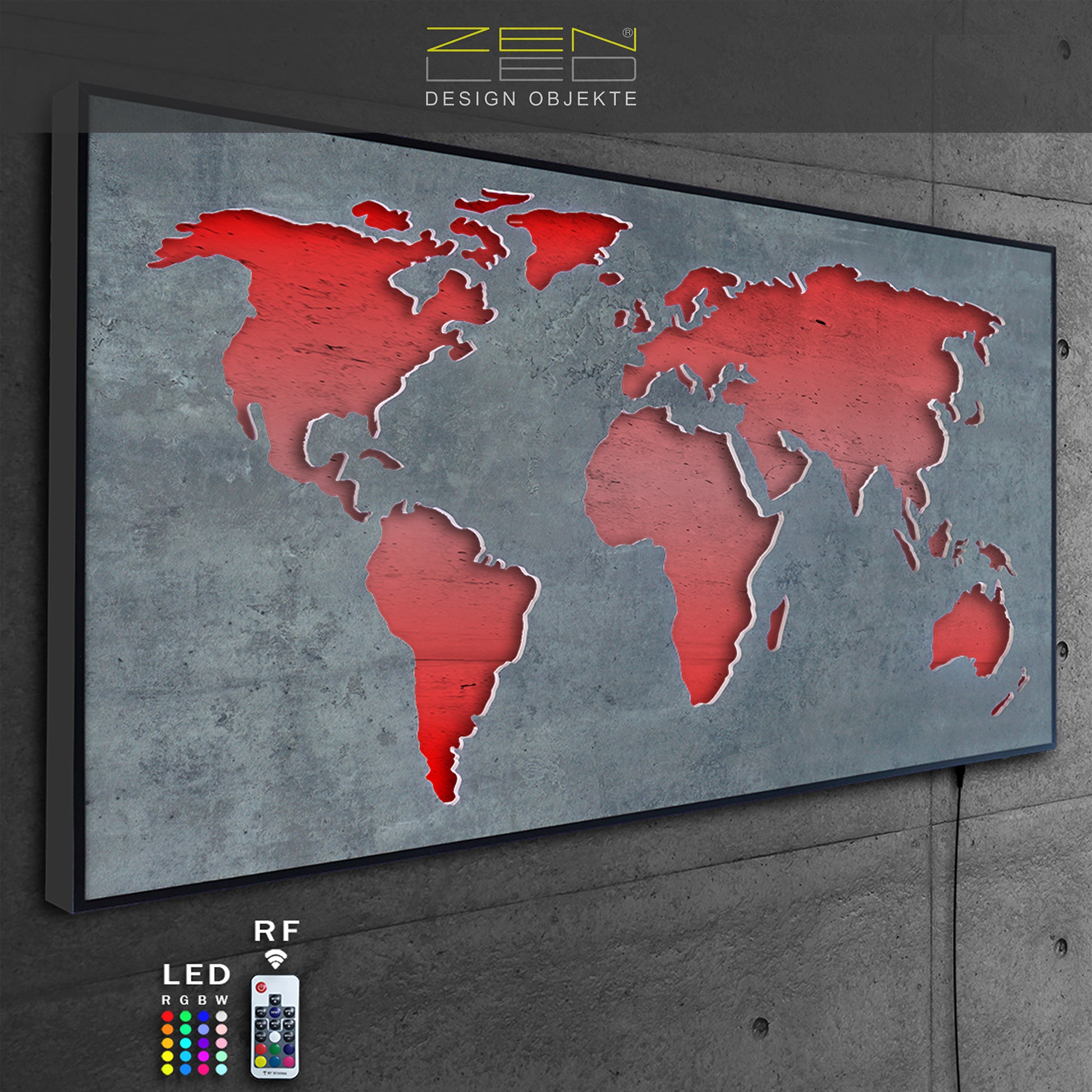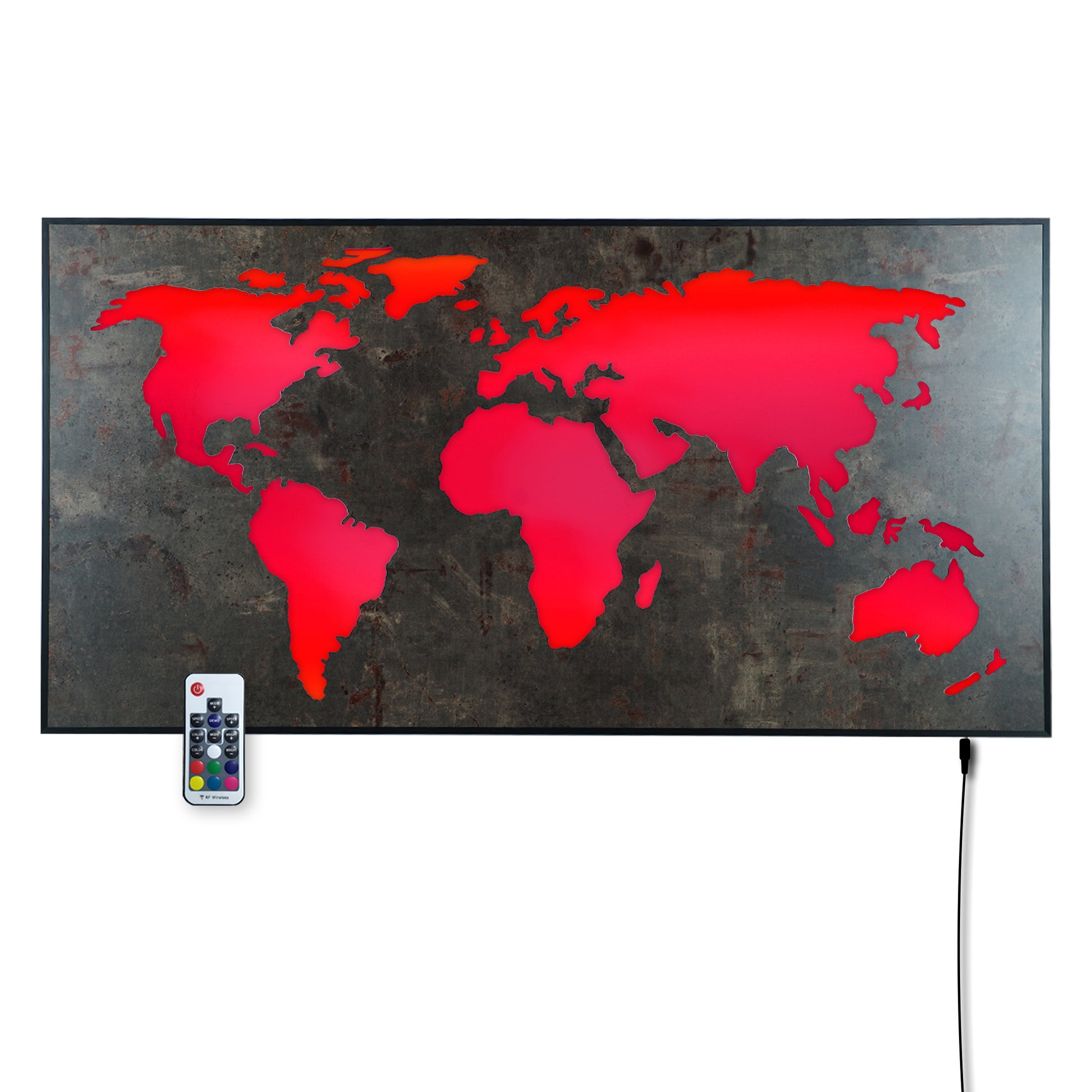 LED 3D Weltkarte MONDO MASCHERA mit ALU Rahmen | STEIN-Optik Serie 110x57cm | Wandobjekt und Leuchtbild mit 3D Effekt | RGB farbig hinterleuchtet mit Fernbedienung | modern industriell Boho City-Chic