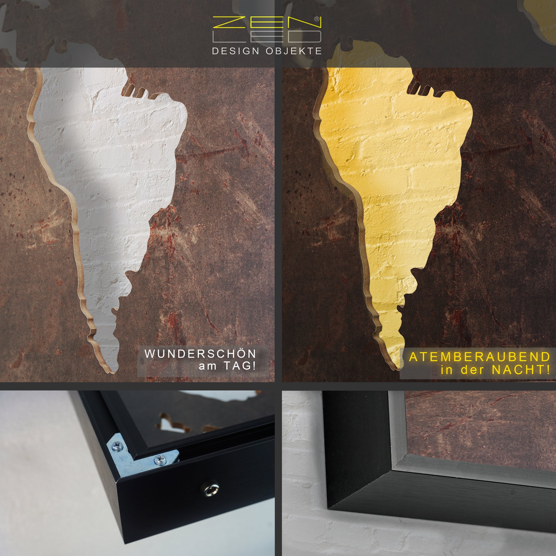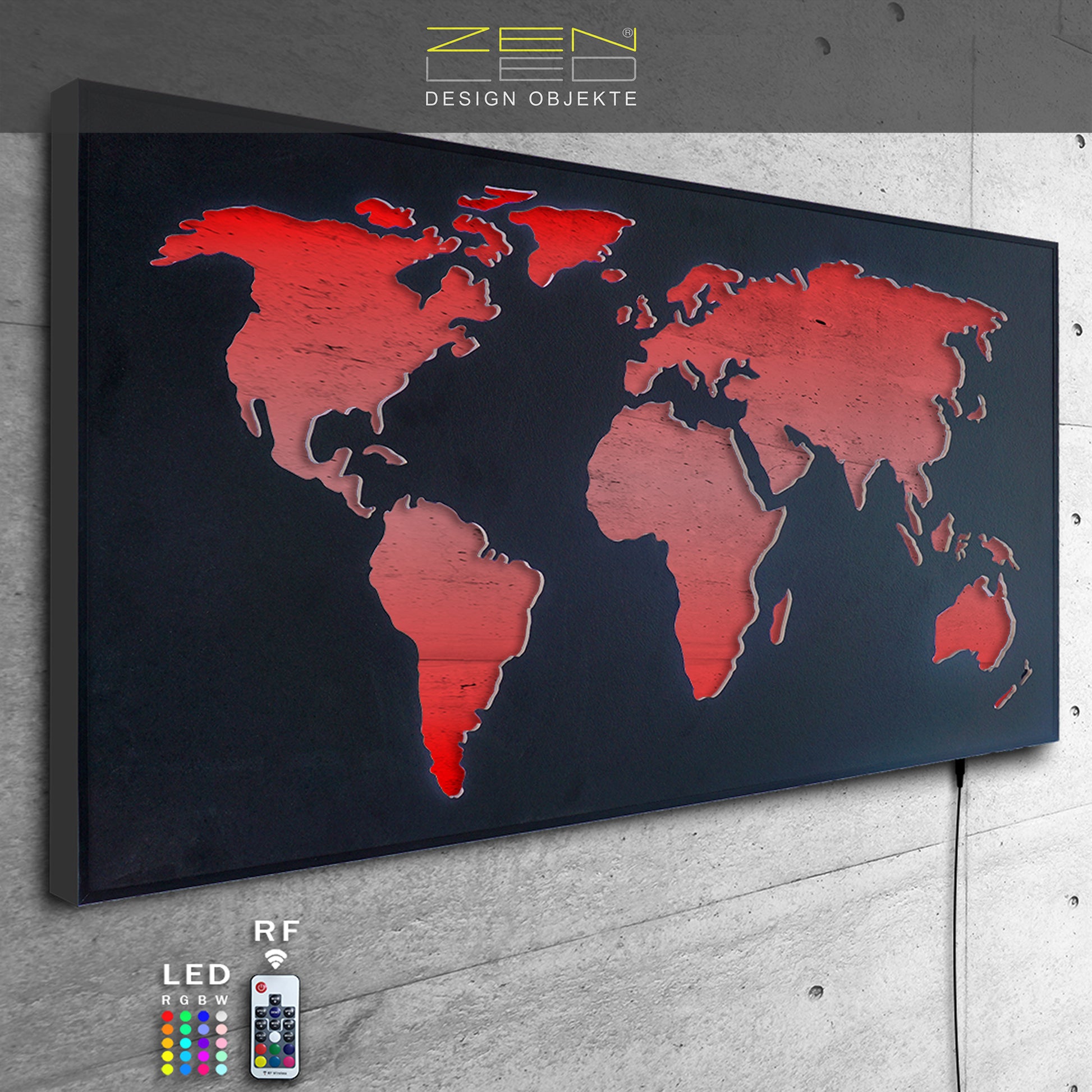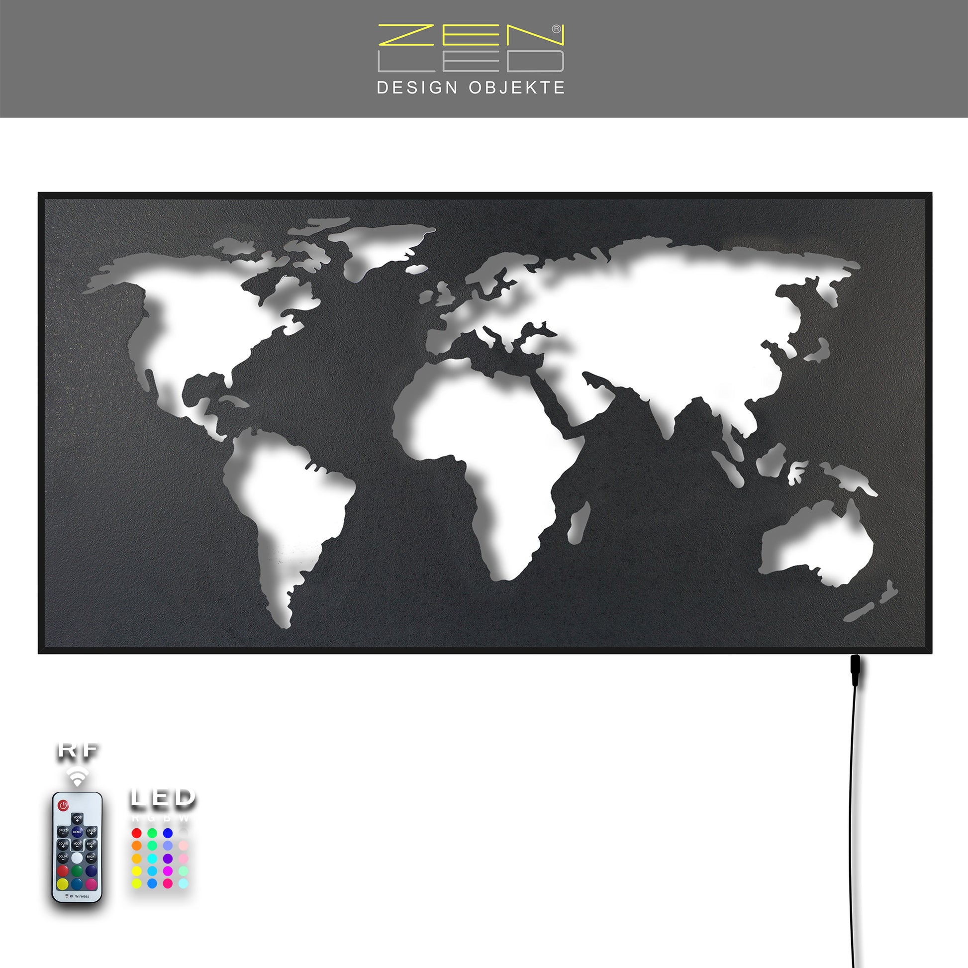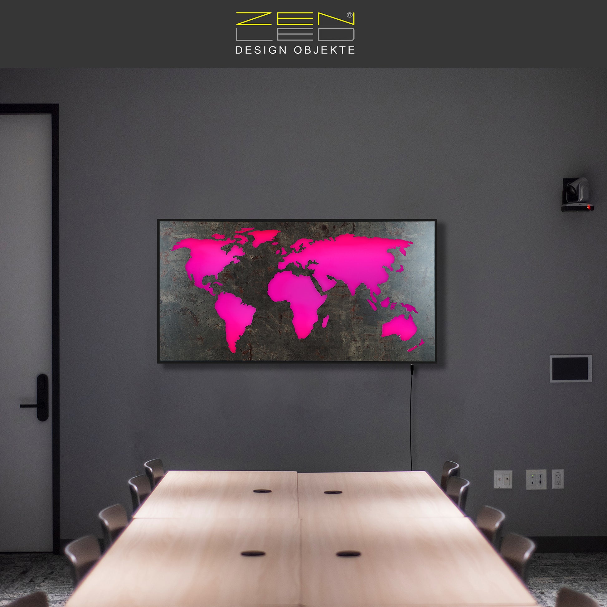 LED 3D Weltkarte MONDO MASCHERA mit ALU Rahmen | STEIN-Optik Serie 110x57cm | Wandobjekt und Leuchtbild mit 3D Effekt | RGB farbig hinterleuchtet mit Fernbedienung | modern industriell Boho City-Chic