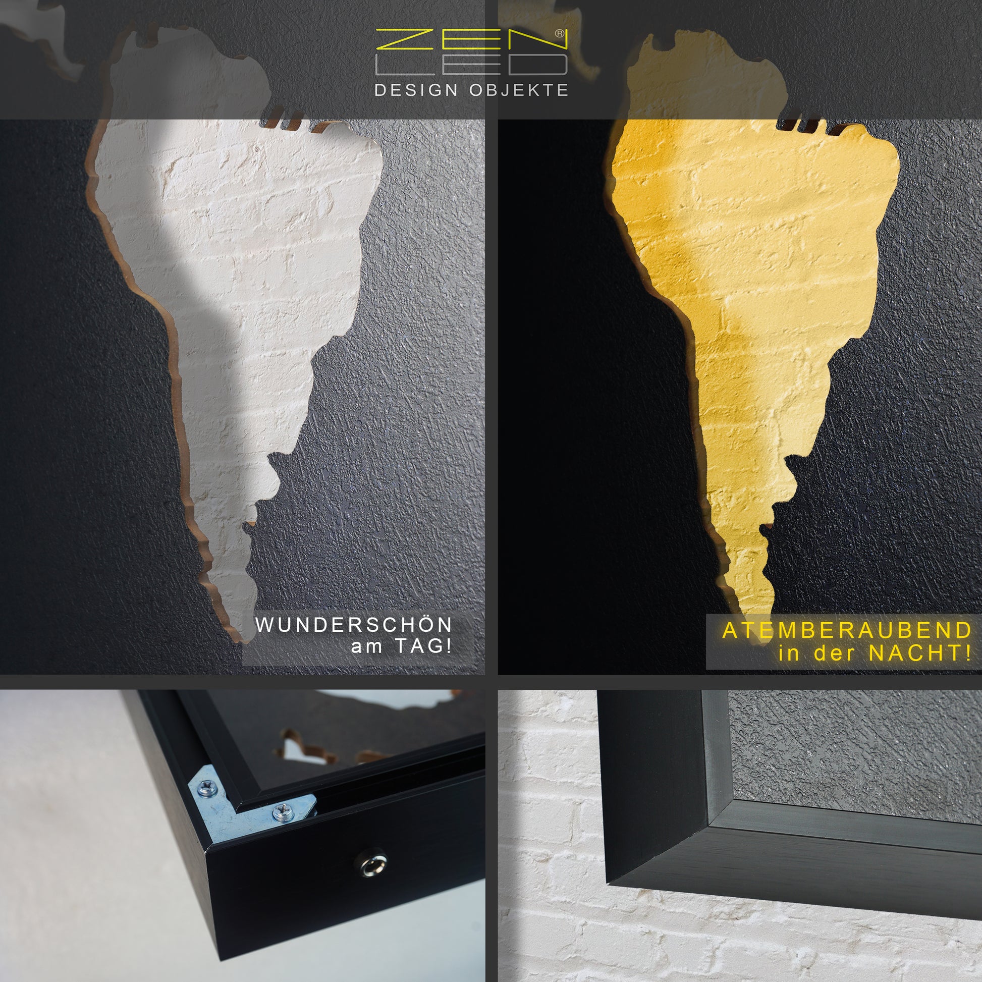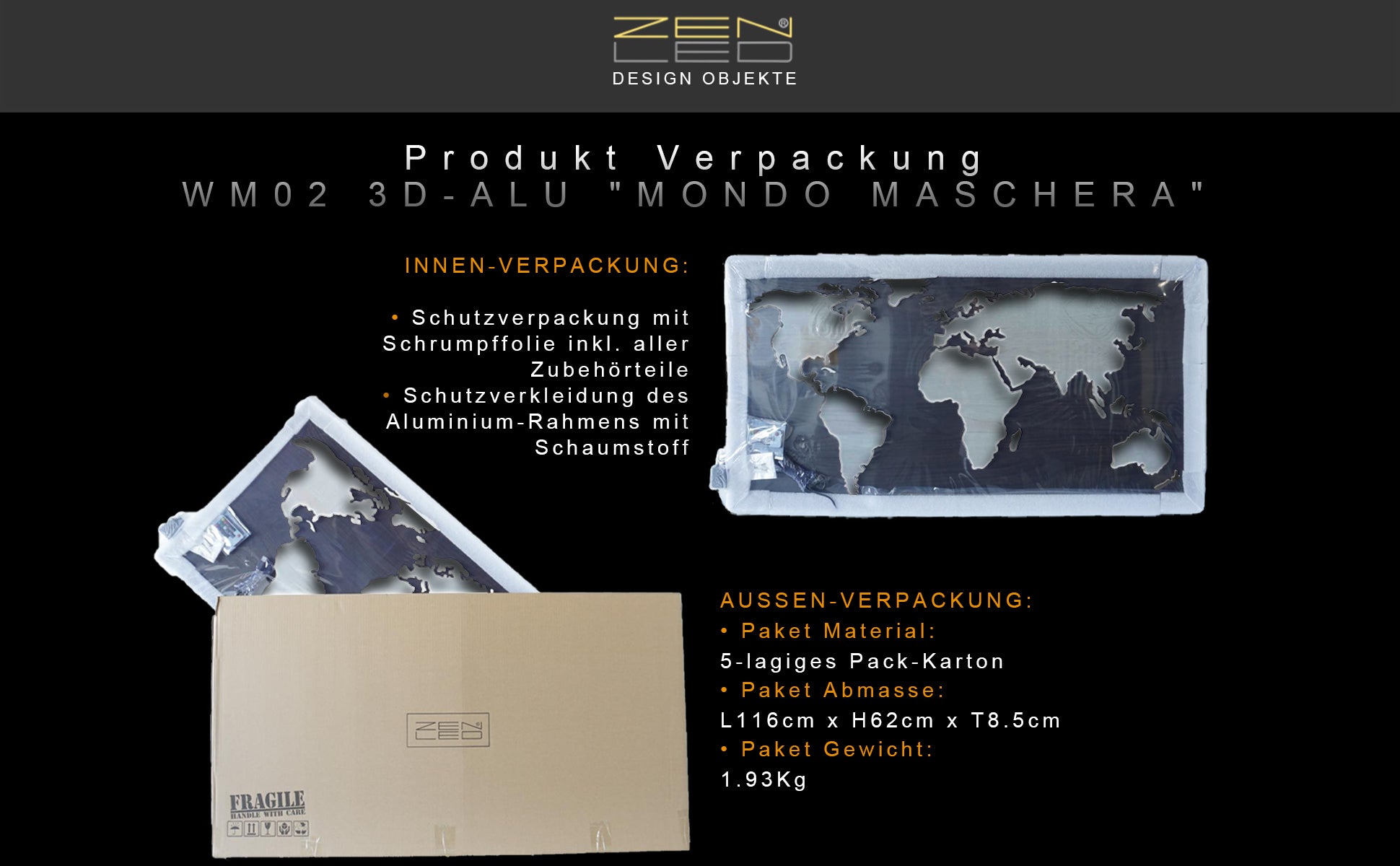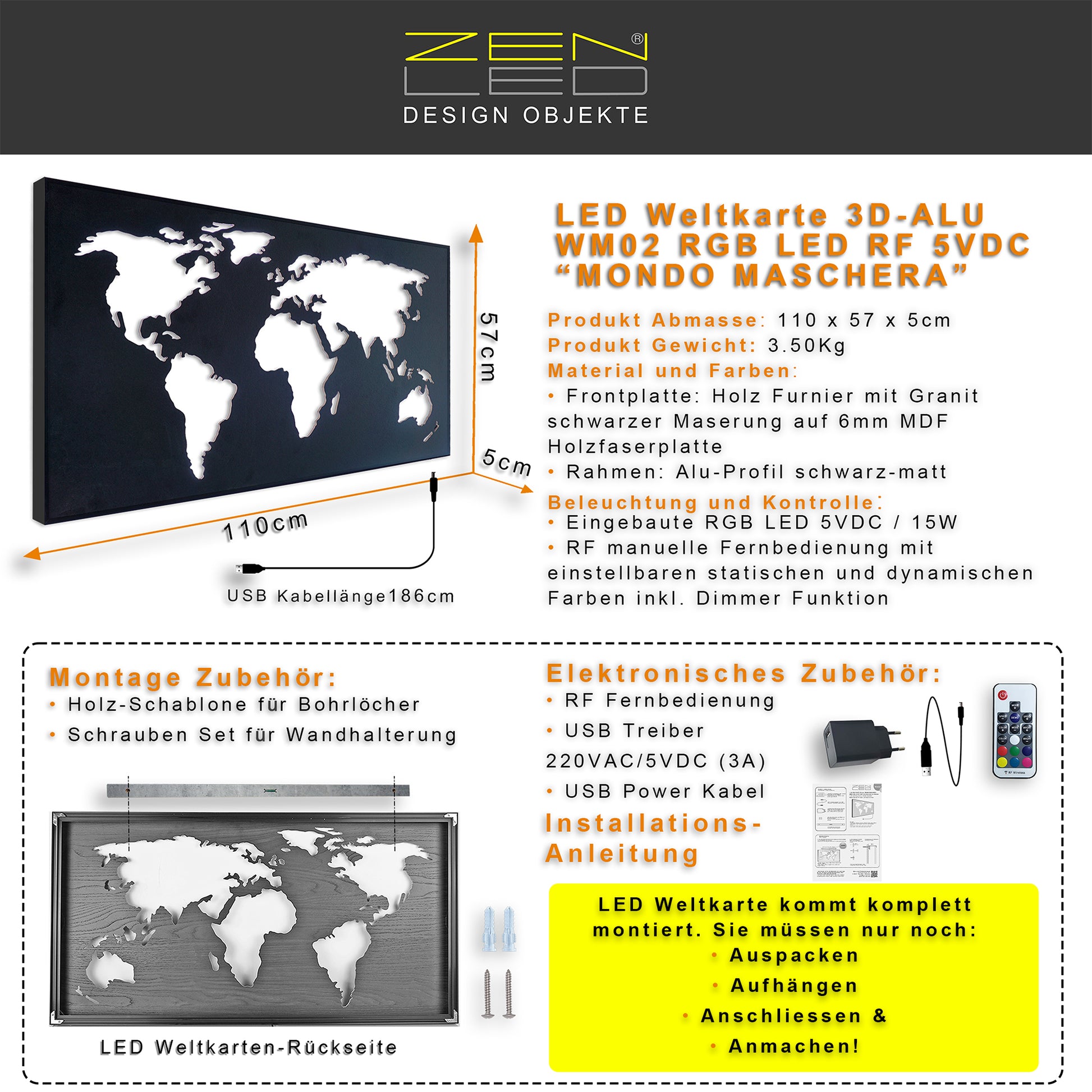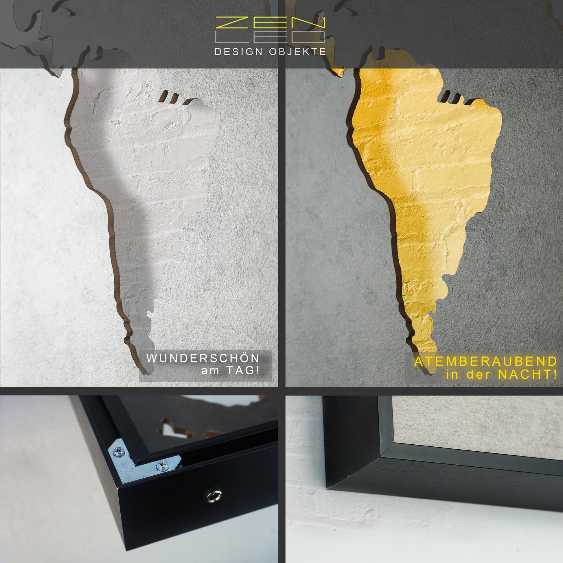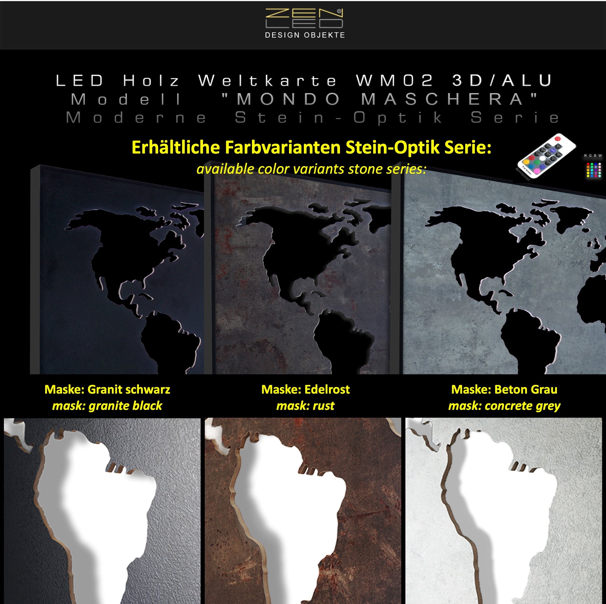 EDLES DESIGN – Die DESIGNER LED Holz Weltkarte 3D mit ALU-Rahmen “MONDO MASCHERA” mit integrierter und Vollfarben einstellbarer RGB LED Beleuchtung und manueller Fernbedienung ist etwas ganz Besonderes. Mit einem minimalistischen und eleganten Design als beleuchtete Wanddekoration konzipiert, fügt es sich gut in vielfältige Raumkonzepte durch die zeitlose und hochwertige Optik.