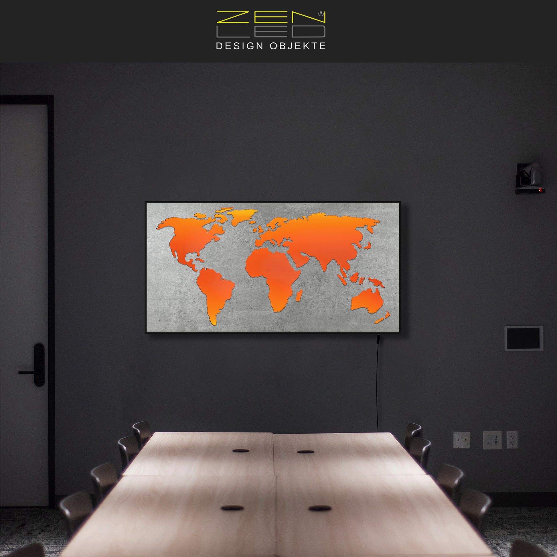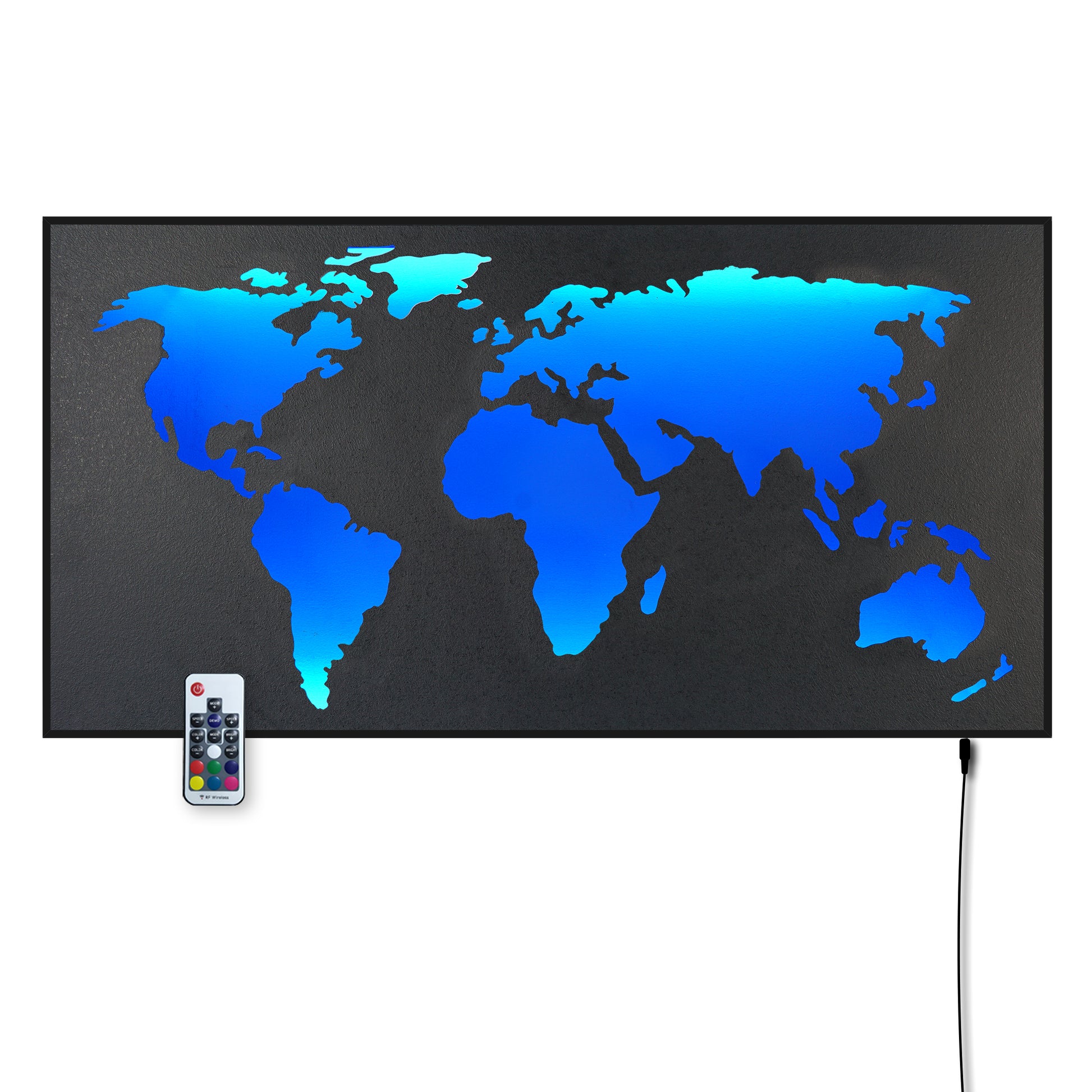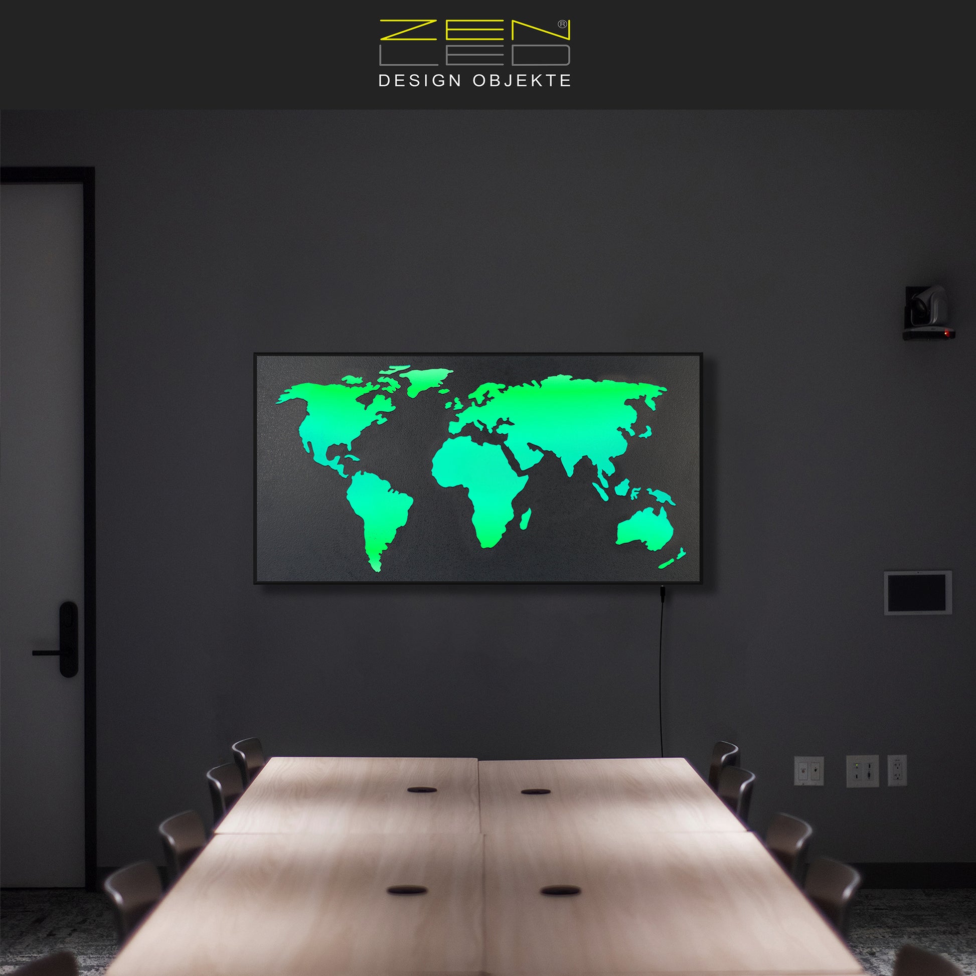 Moderne 3D Weltkarte mit ALU-Rahmen und hochwertiger LED-Technologie als Wanddekoration und Stimmungslicht in der Größe: Breite 110cm x Höhe 57cm x Tiefe 5cm.