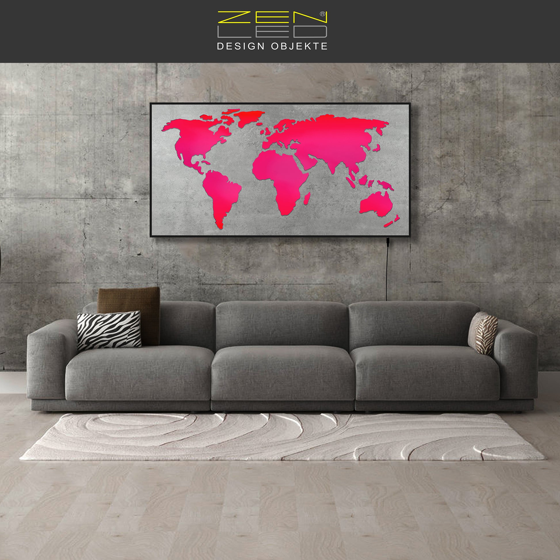 Die hinterleuchtete LED-Weltkarte mit NATURSTEIN-Optiken wird im Wohnzimmer zum Deko Highlight.