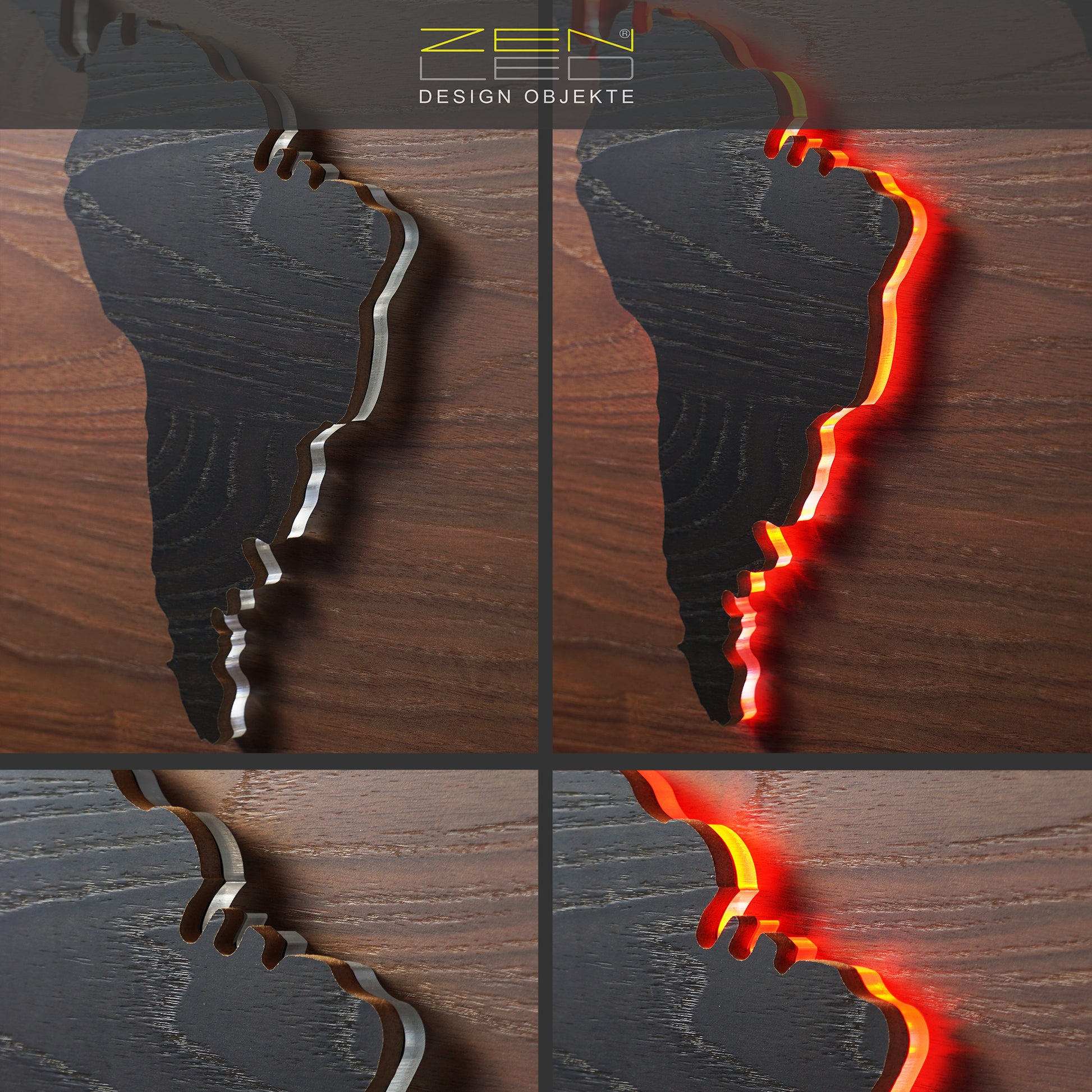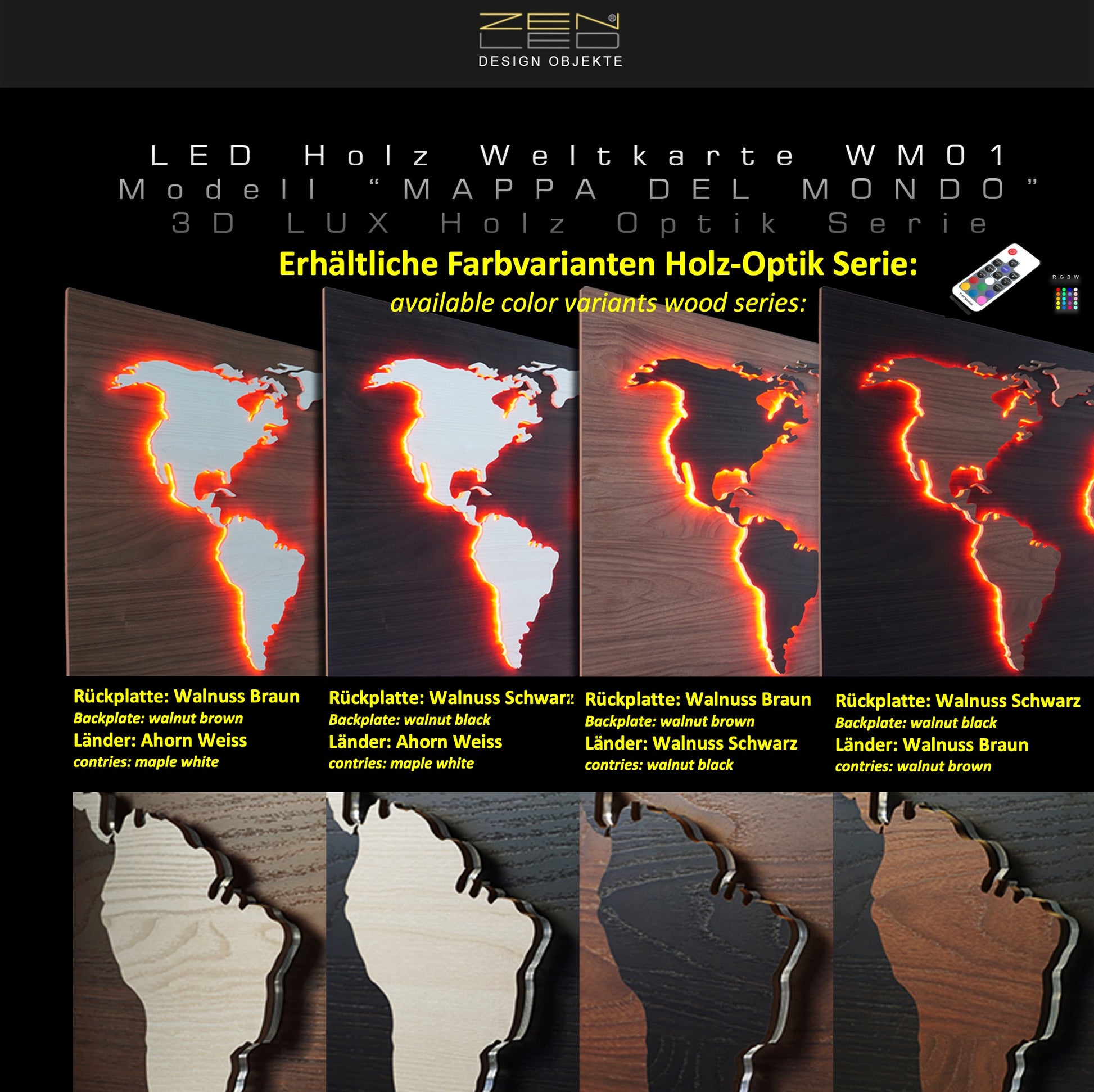 ABSOLUTER HINGUCKER - Beleuchtetes Wandbild in 110x57cm mit einer Holzfurnier-Grundplatte und Kontinenten/Länderausschnitten wahlweise in den Varianten-Serien mit HOLZ-Optiken mit Walnuss- und Ahorn-Maserungen mit unterschiedlichen Farbkombinationen.