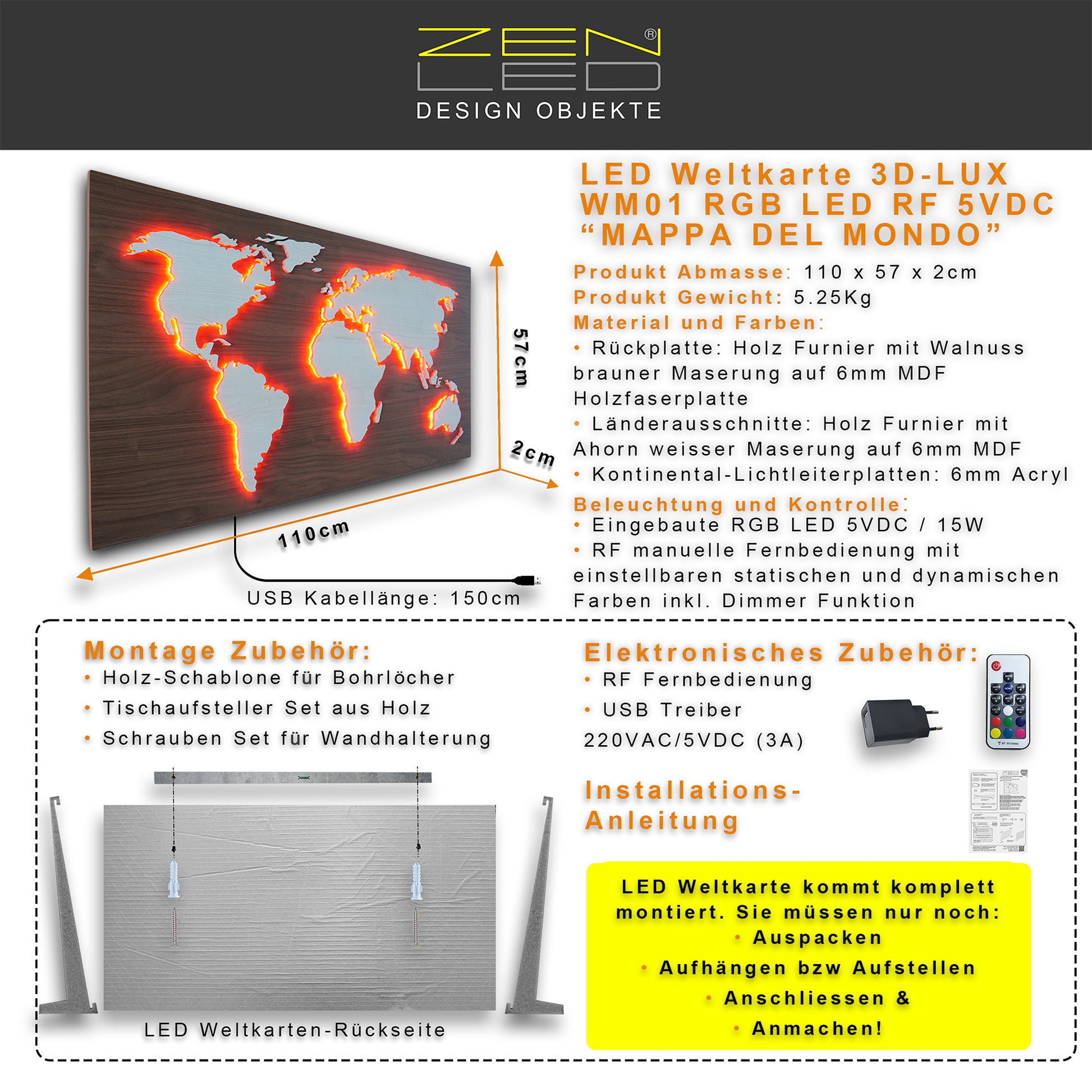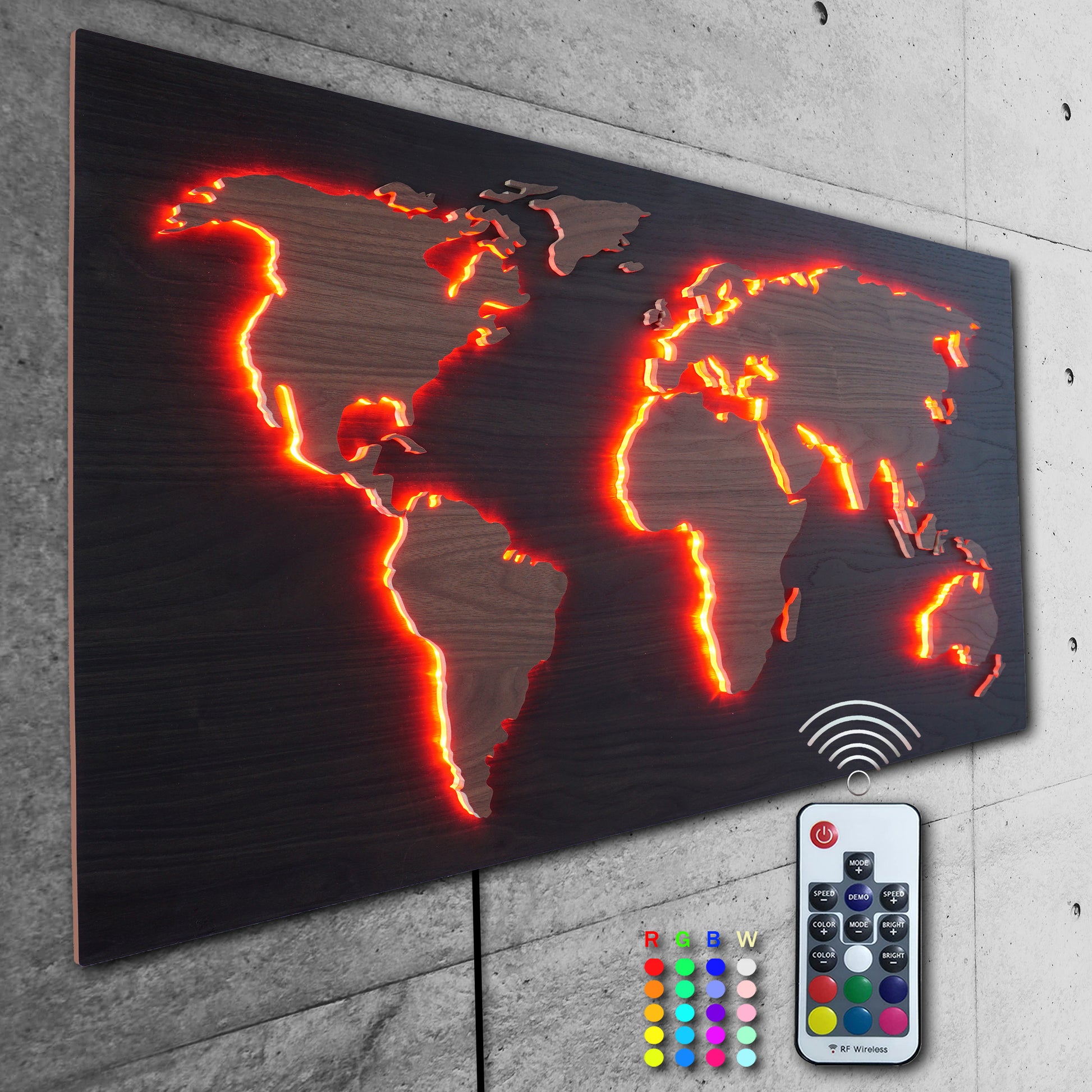 EDLES DESIGN – Die DESIGNER LED Holz Weltkarte 3D LUX “MAPPA DEL MONDO” mit intelligent integrierter und vollfarben einstellbarer RGB LED Beleuchtung mit manueller Fernbedienung ist etwas ganz Besonderes. Mit einem minimalistischen und eleganten Design als beleuchtete Wanddekoration konzipiert, fügt es sich gut in vielfältige Raumkonzepte durch die zeitlose und hochwertige Optik. Ausgezeichnet für Stimmungs- und Umgebungslicht für Ihre Wohn- und Arbeitsräume.