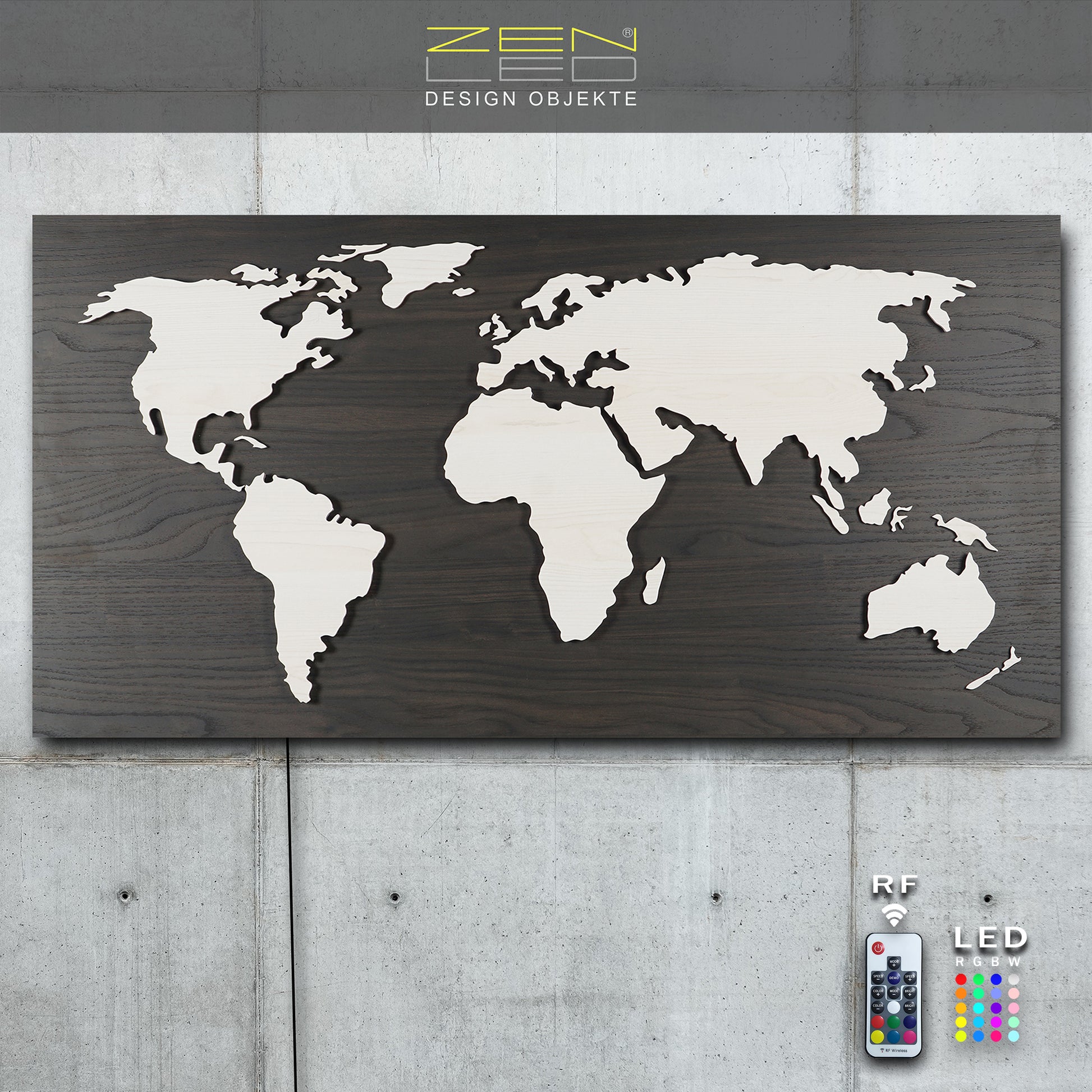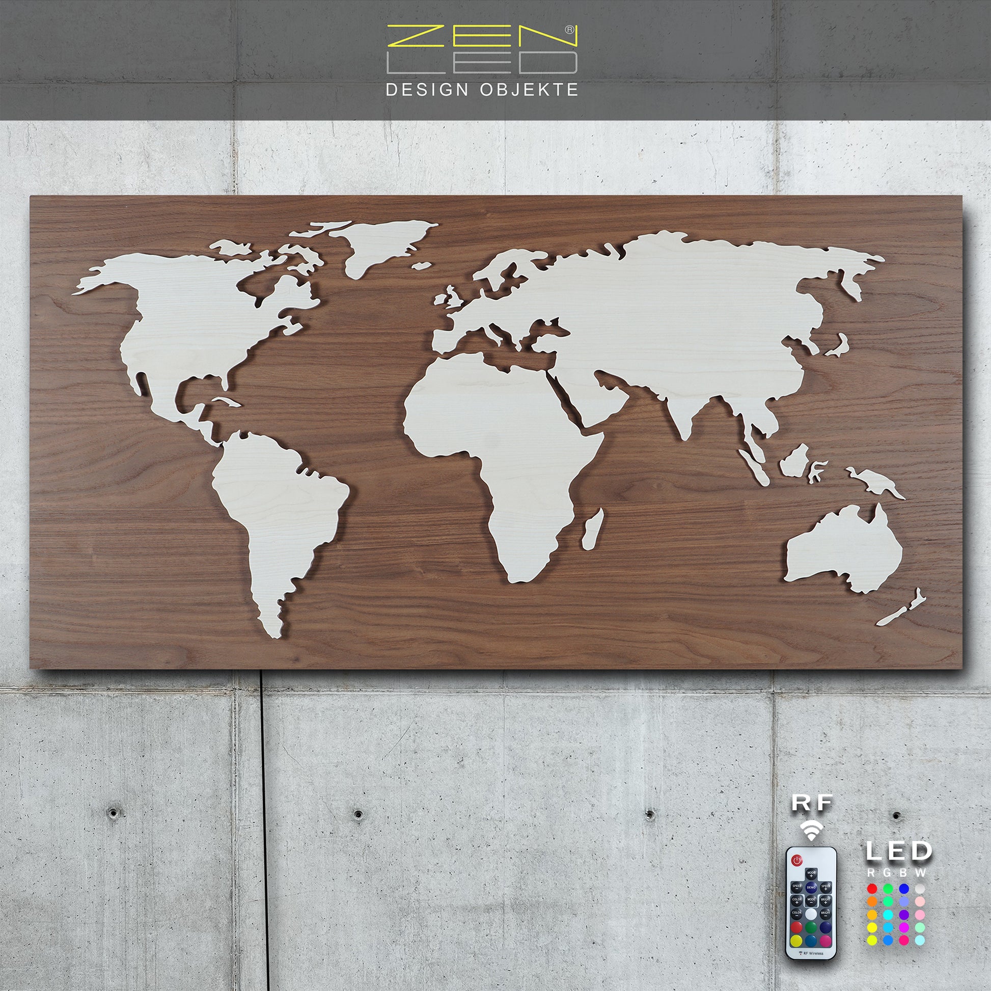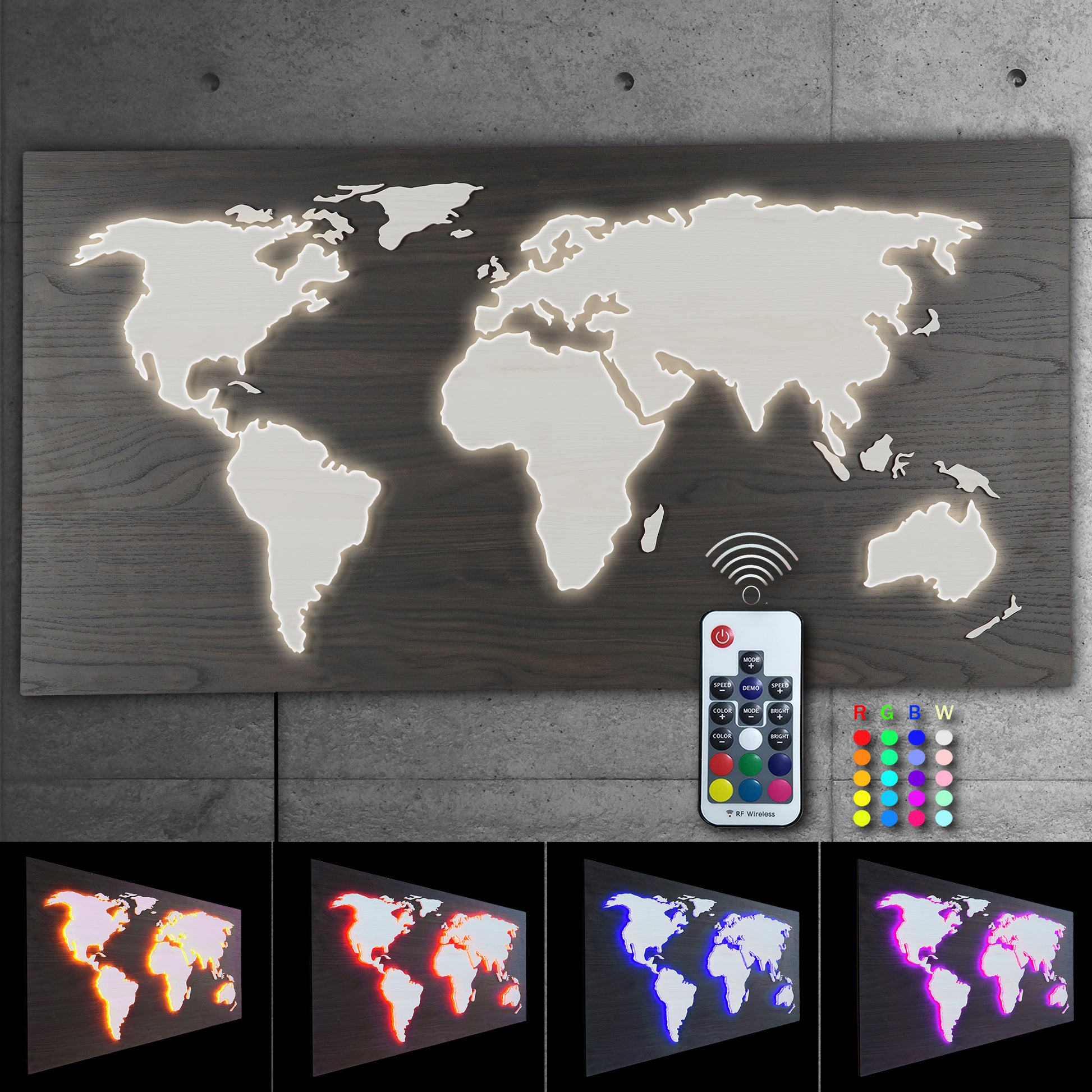 LED Designer LUX Weltkarte MAPPA DEL MONDO | HOLZ-Optik Serie 110x57cm | Wandobjekt und Leuchtbild mit 3D Effekt | farbige RGB Beleuchtung mit Fernbedienung | Vintage Landhaus Boho Shabby-Chic