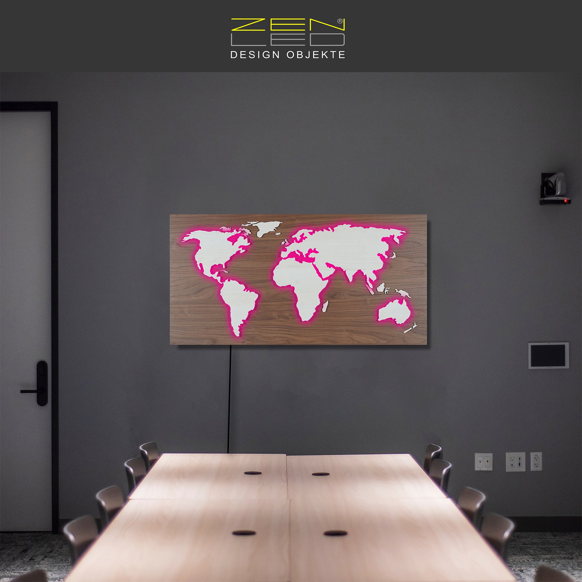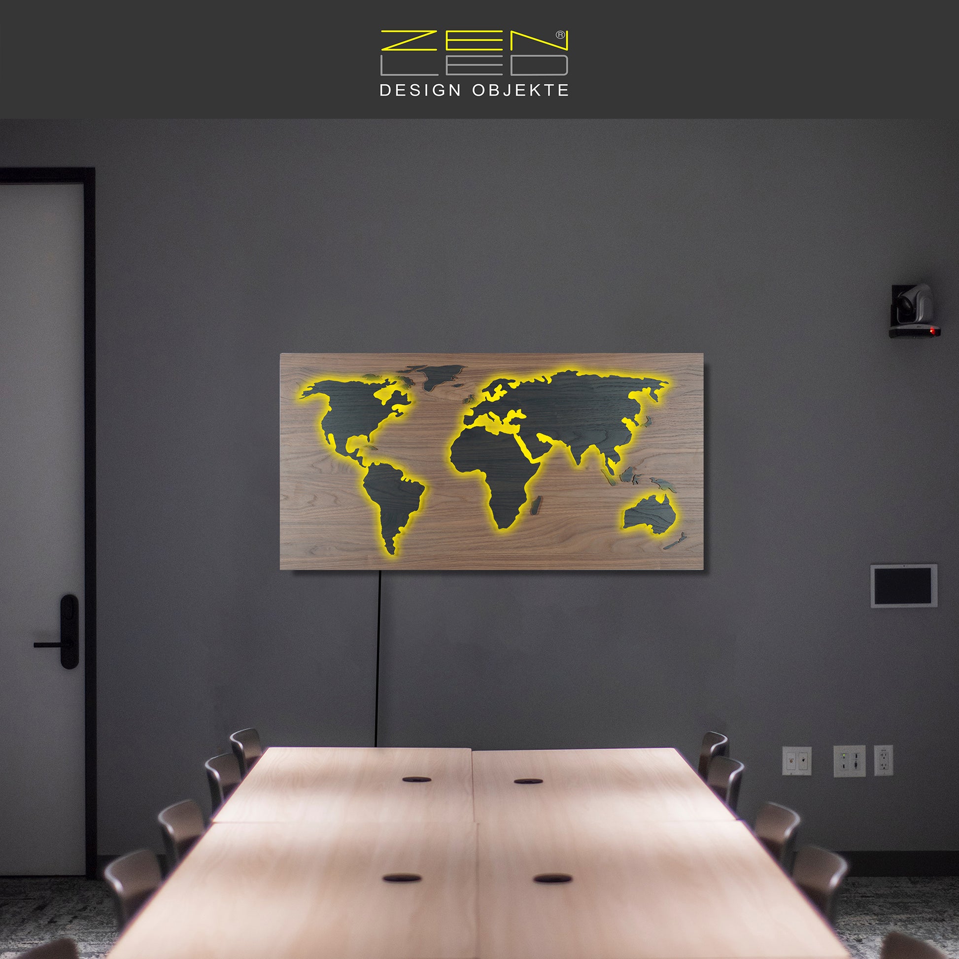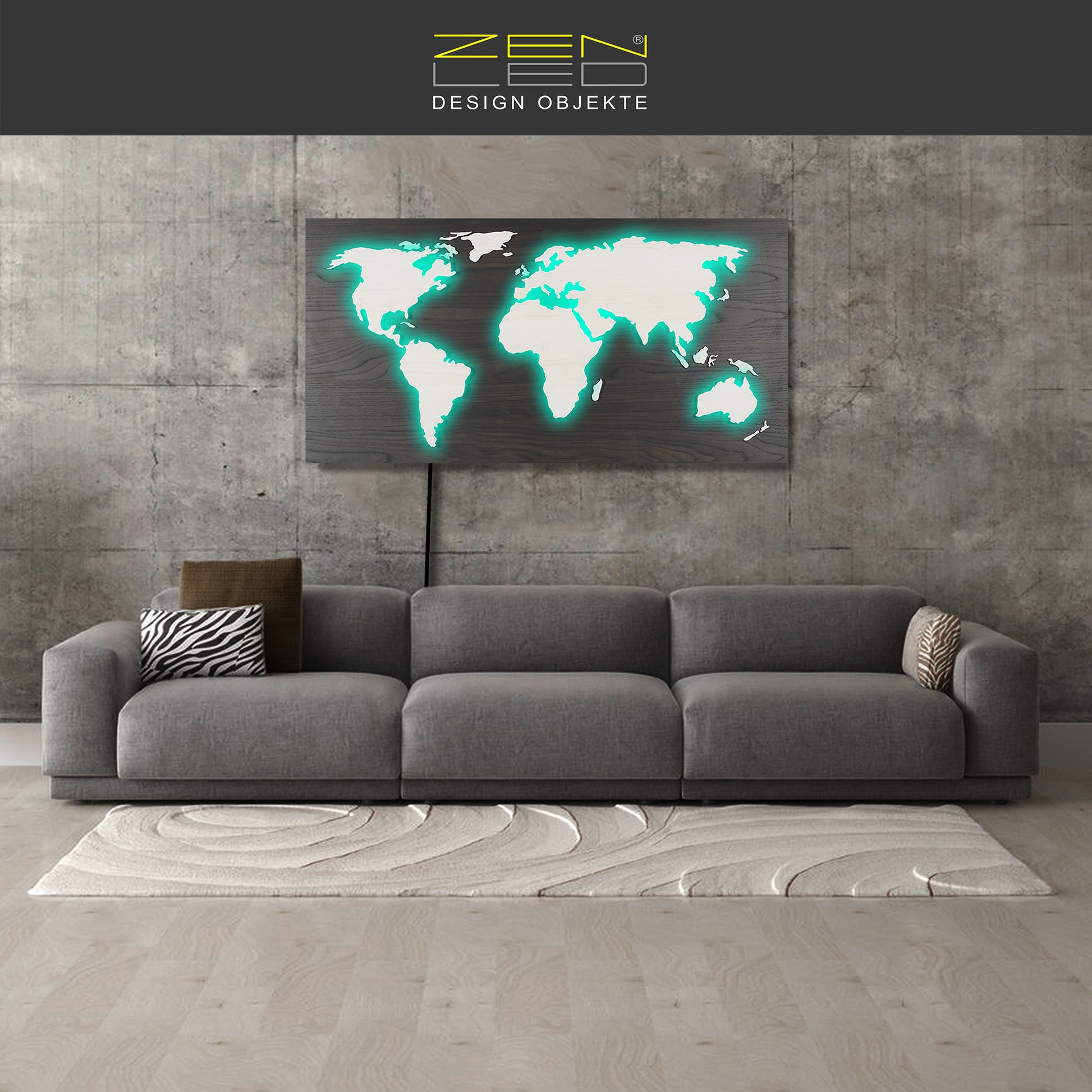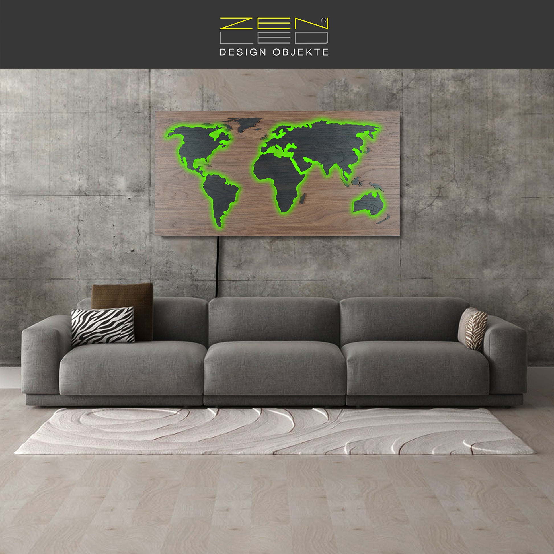 Die hinterleuchtete LED-Weltkarte in natürlichen HOLZ-Optiken werden im Wohnzimmer zum Deko Highlight.