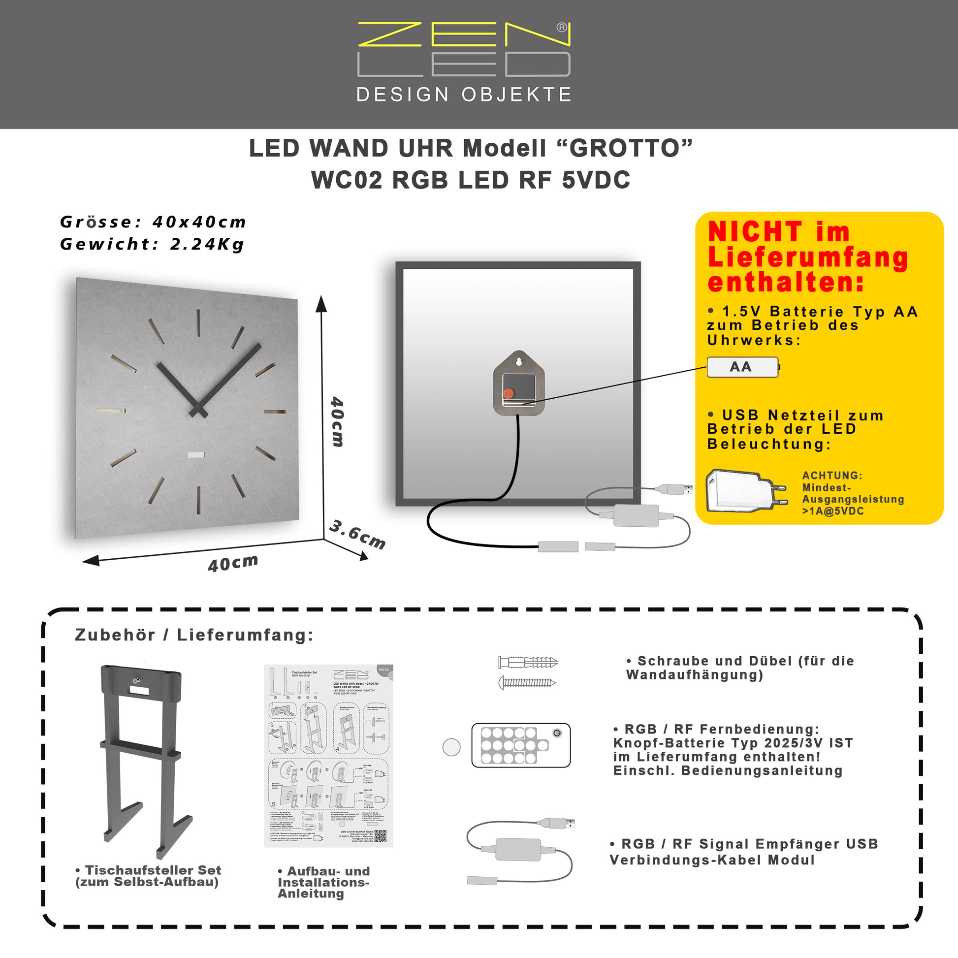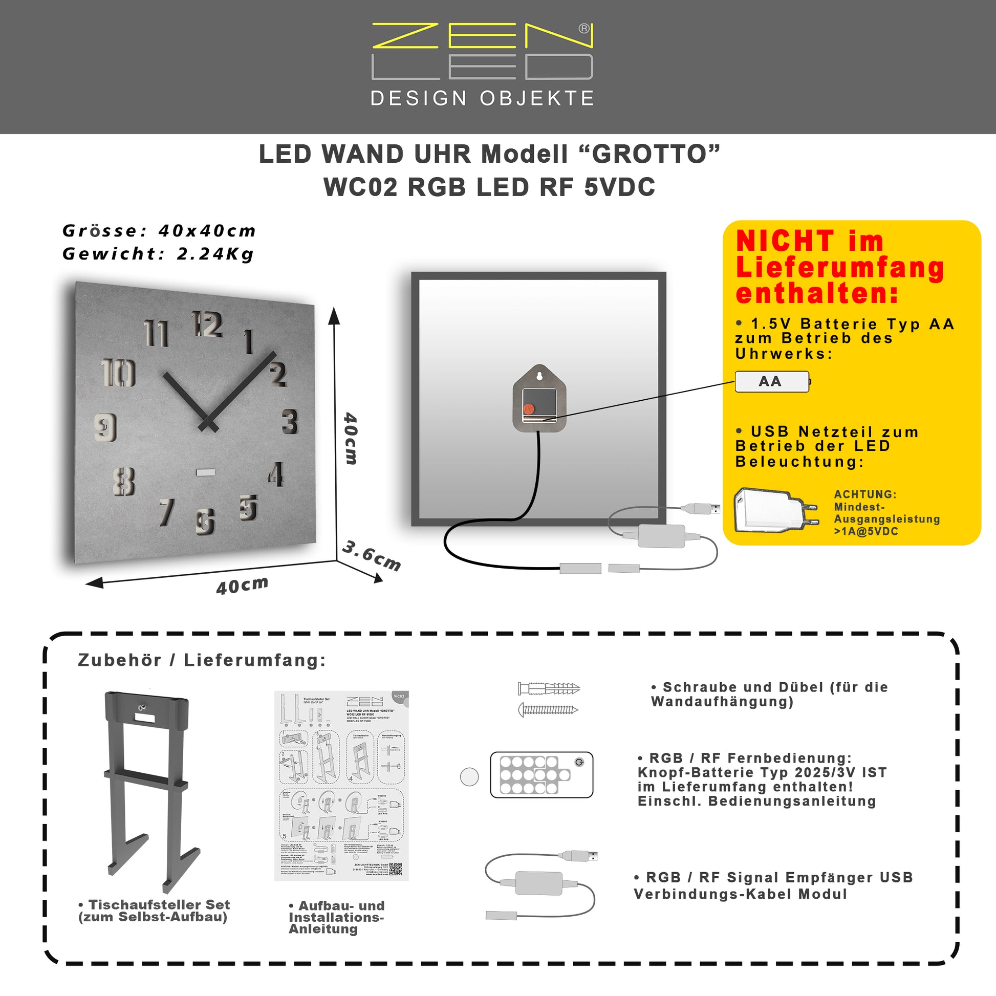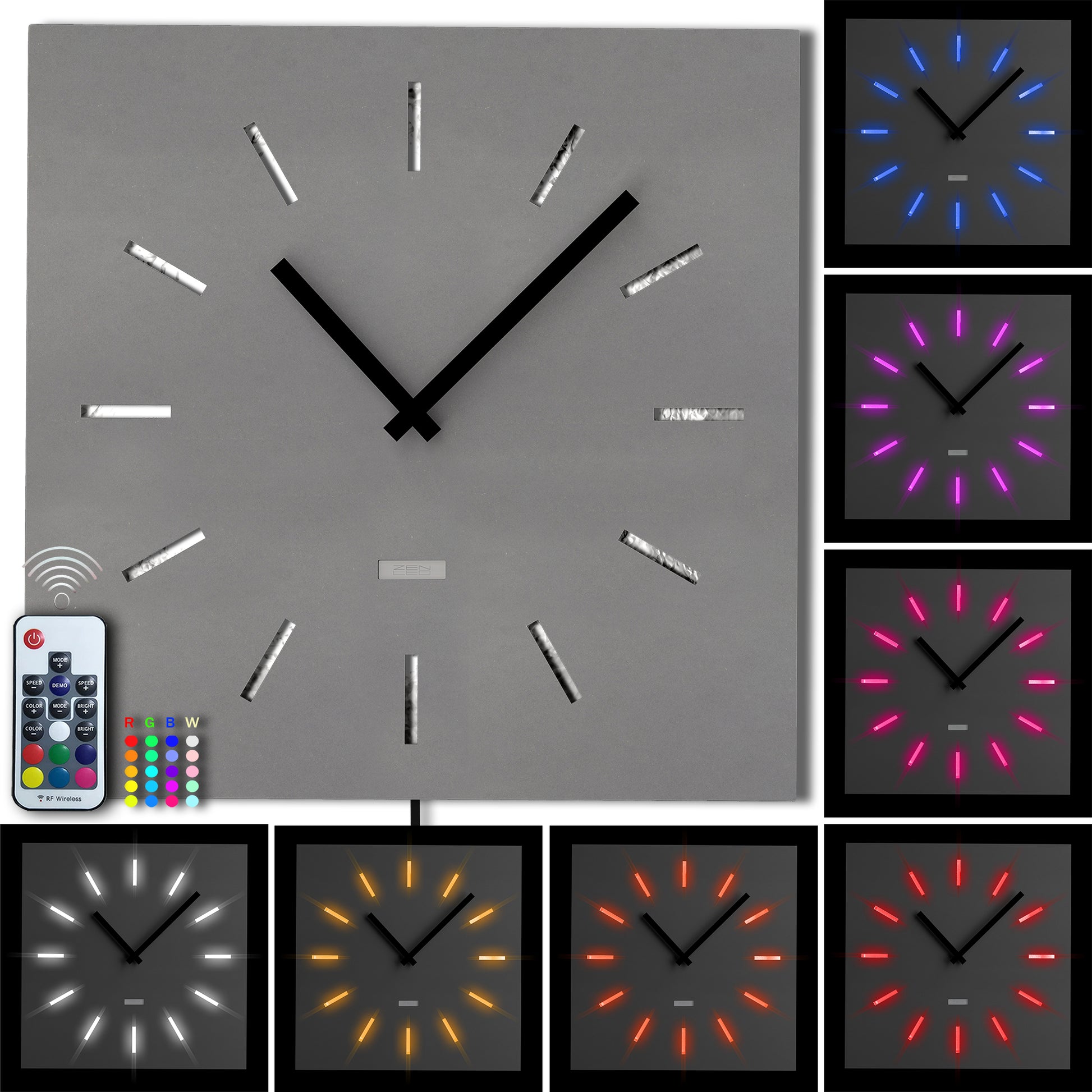RGB farbig hinterleuchtete LED-Wanduhr "GROTTO" in ECKIG 40x40cm mit 3D Effekt und lautlosem Quarz Uhrwerk ohne Tick- Geräusche.