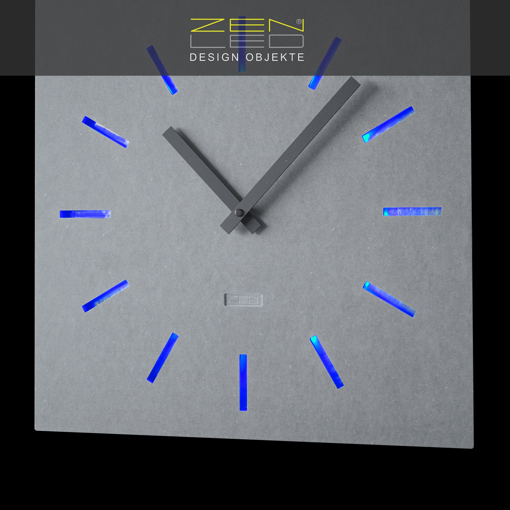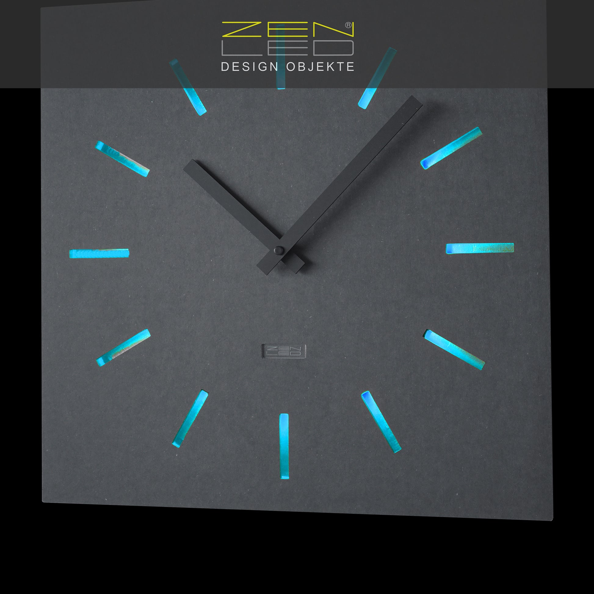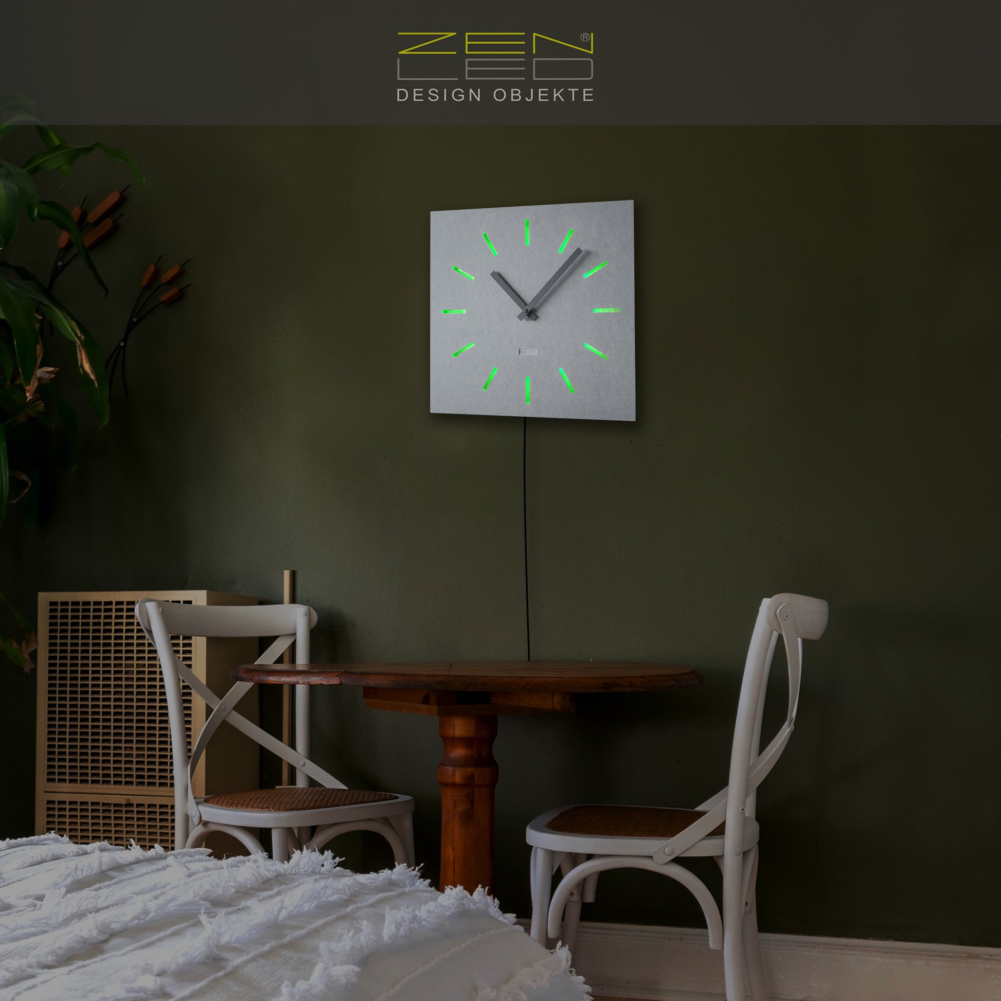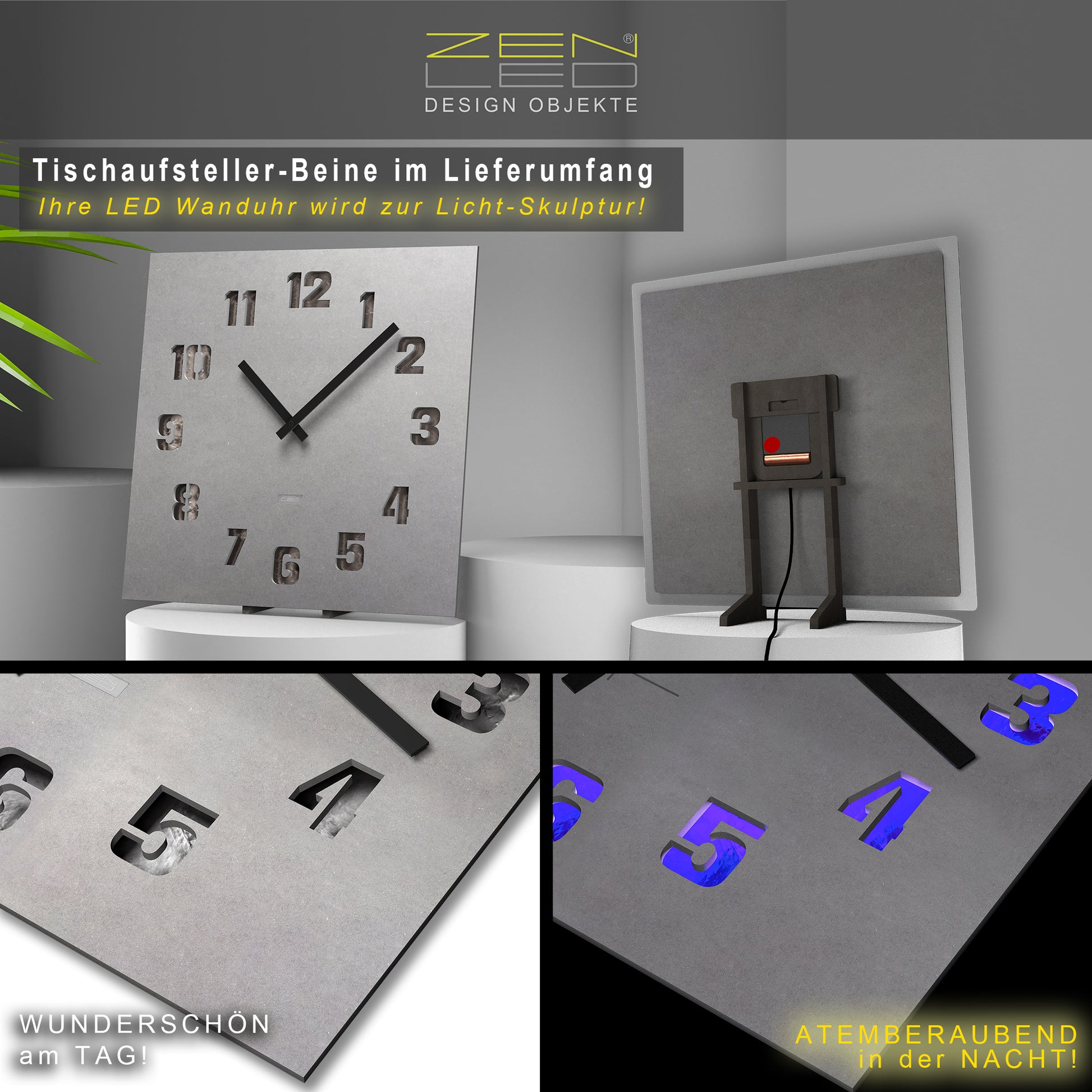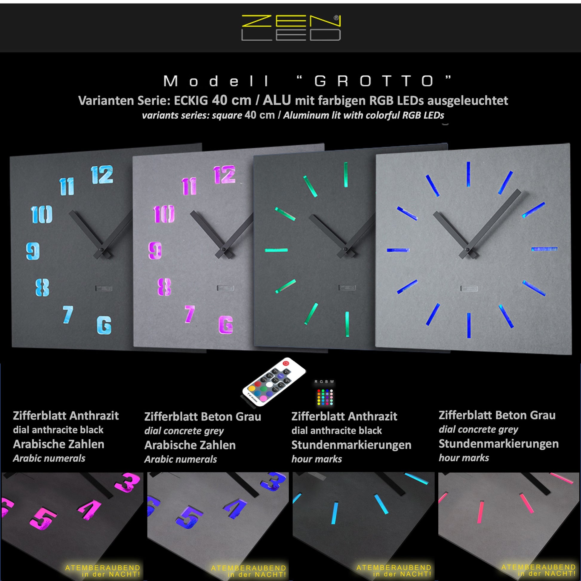 STILVOLL - Die beleuchtete Holz-Wanduhr in der Größe ECKIG XL 40x40cm mit einem QUADRATISCHEM Ziffernblatt aus durchtränktem original FORESCOLOR MDF in ANTHRAZIT-SCHWARZ oder BETON-GRAU, in den Design-Varianten mit ausgehöhlten Arabischen ZAHLEN oder Stundenmarkierungen, die mit ALU-Metall-Plättchen ausgelegt und mit den eingebauten VOLL-FARBIGEN RGB LEDs elegant ausgeleuchtet werden.