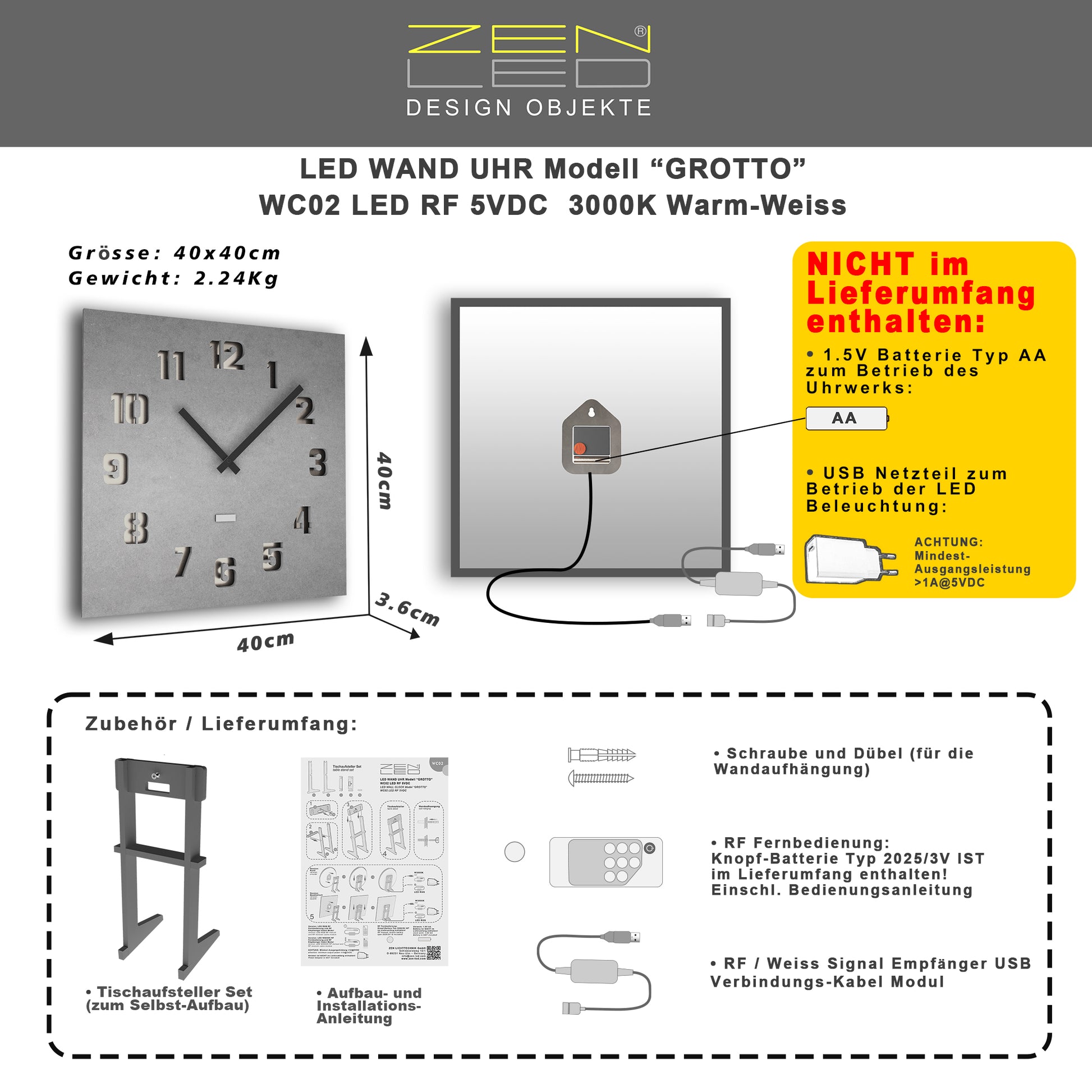 - Ein USB-Netzteil für den Anschluss und Betrieb der LED-Beleuchtung an der Steckdose (jedes Standard USB Ladegerät für Smartphones oder iPads mit einer Mindest-Ausgangsleistung von 1.0 Ampere / 5 V = 5W ist geeignet).