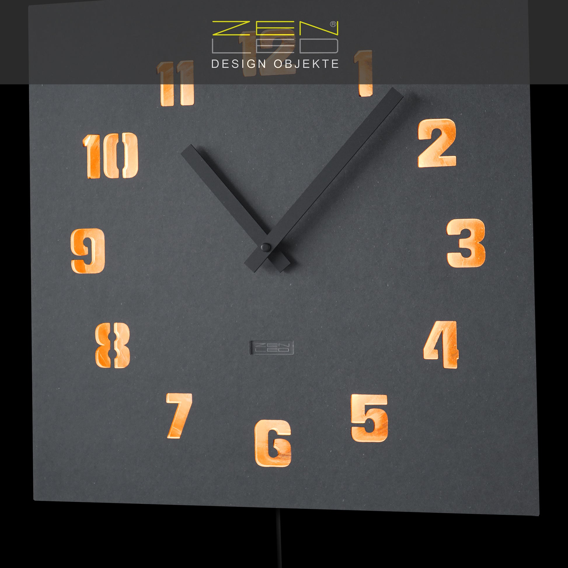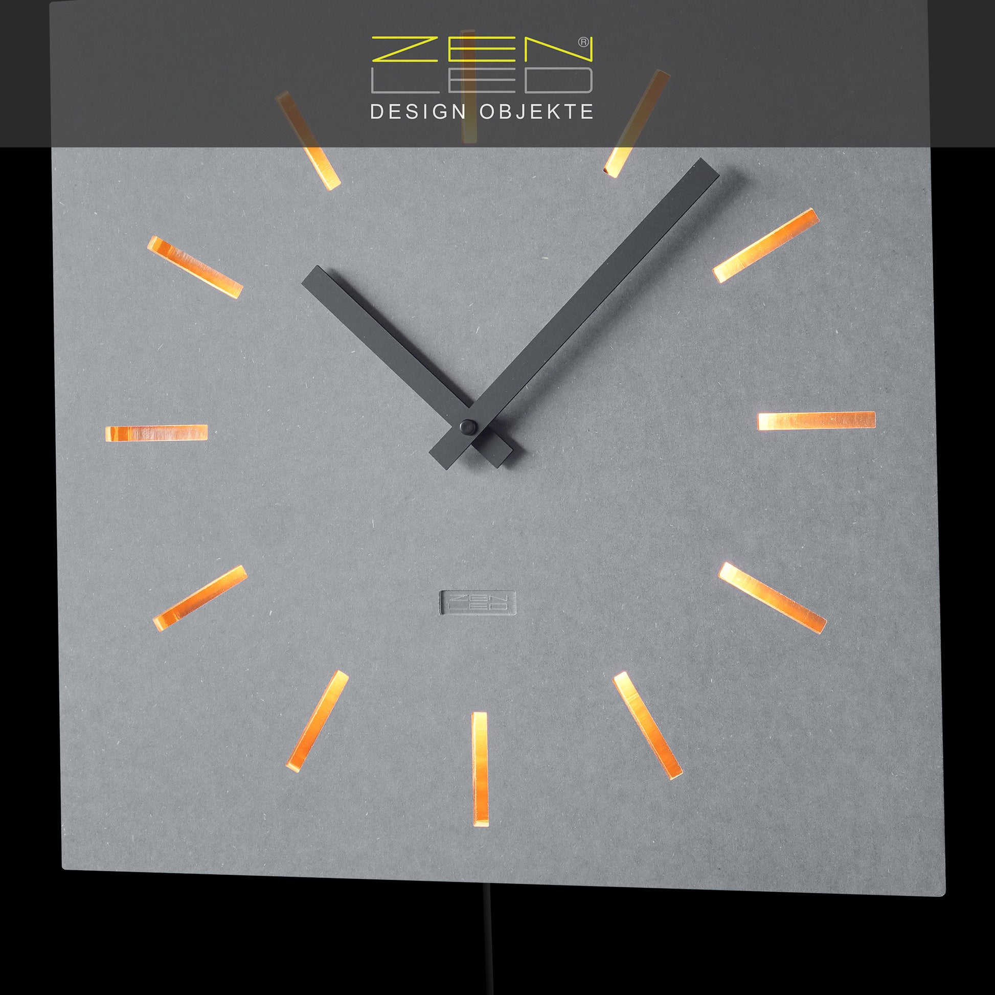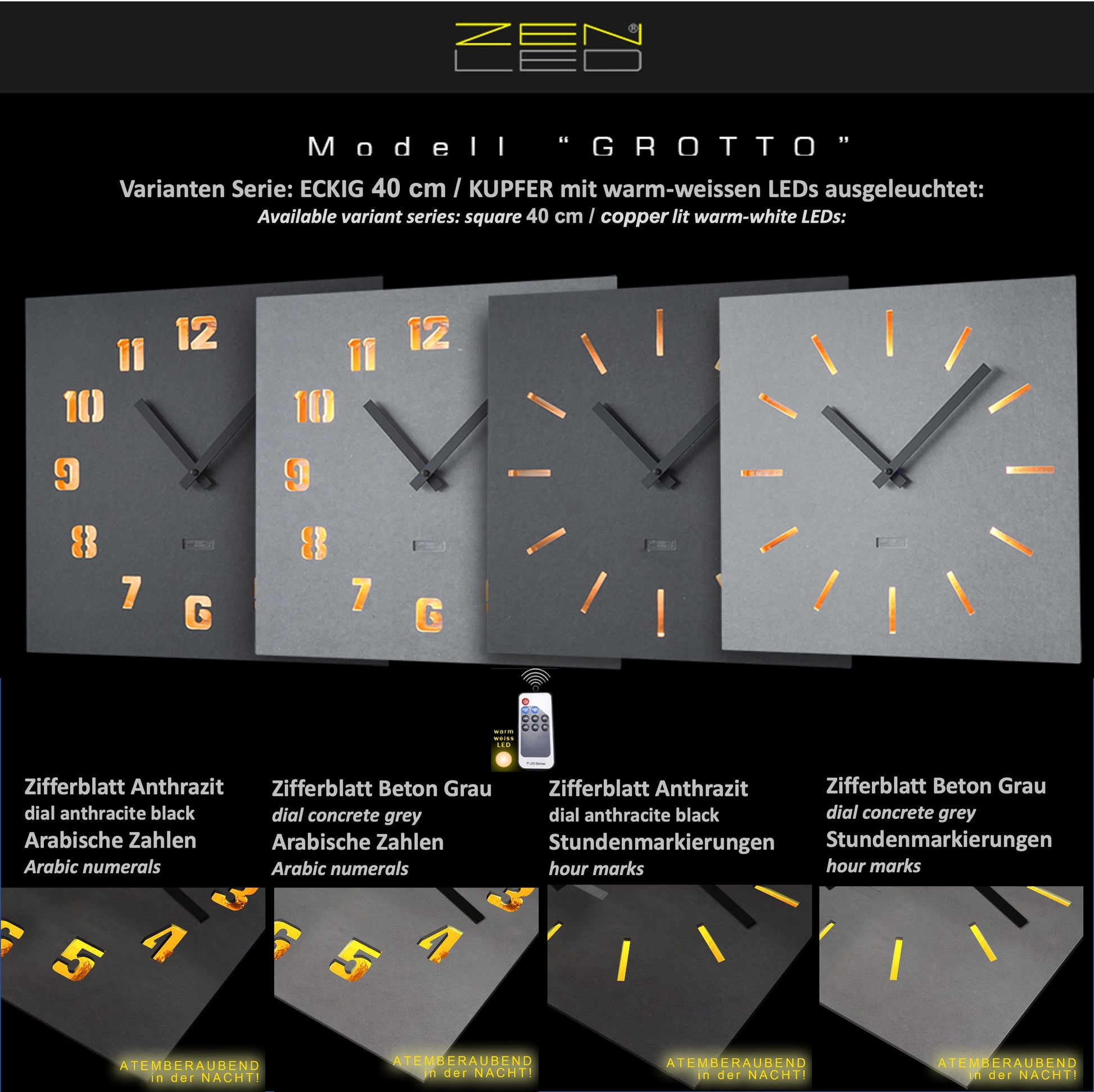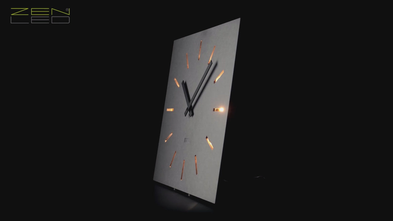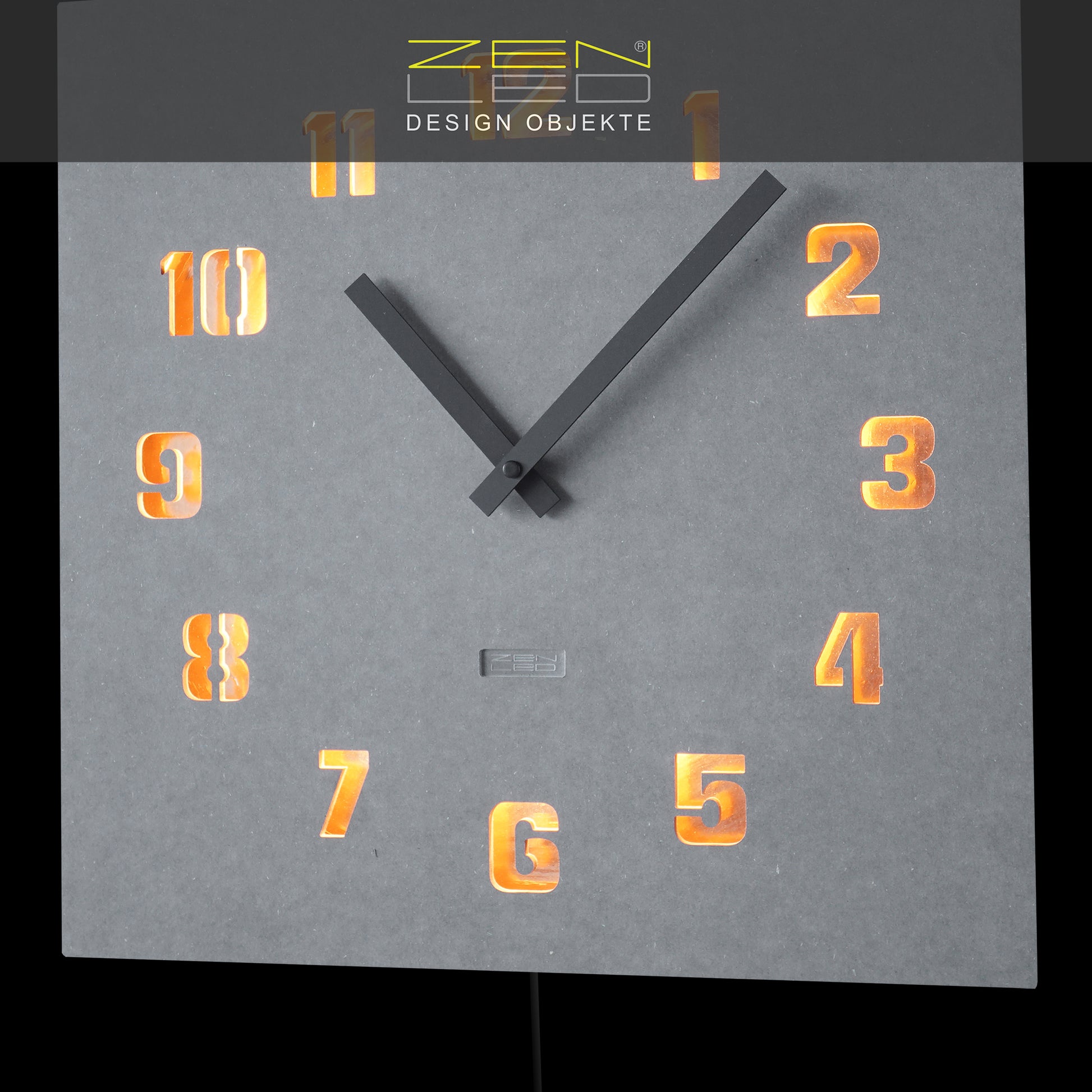 STILVOLL - Die beleuchtete Wanduhr in der Größe ECKIG XL 40x40cm mit einem QUADRATISCHEM Ziffernblatt aus durchtränktem original FORESCOLOR MDF in ANTHRAZIT-SCHWARZ oder BETON-GRAU, in den Design-Varianten mit ausgehöhlten Arabischen ZAHLEN oder Stundenmarkierungen, die mit KUPFER Metall-Plättchen ausgelegt und mit den eingebauten WARM-WEISSEN LEDs elegant ausgeleuchtet werden.