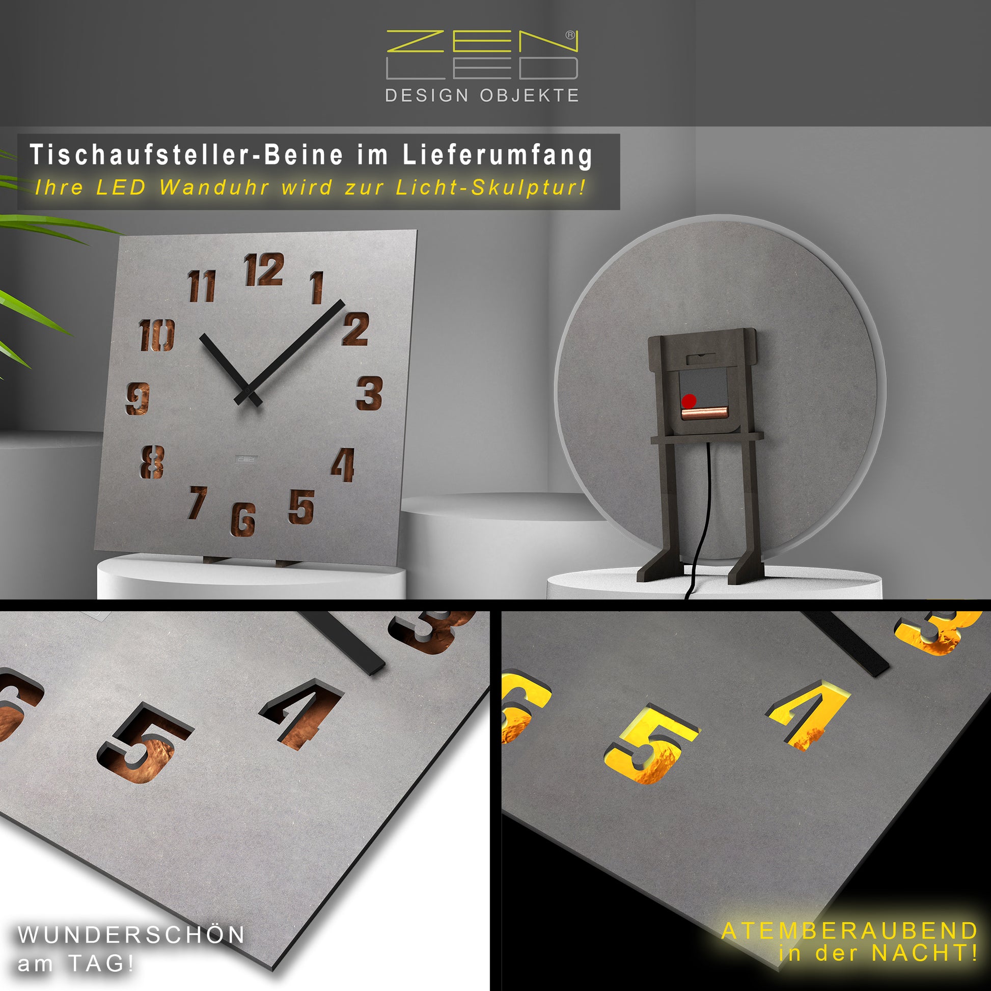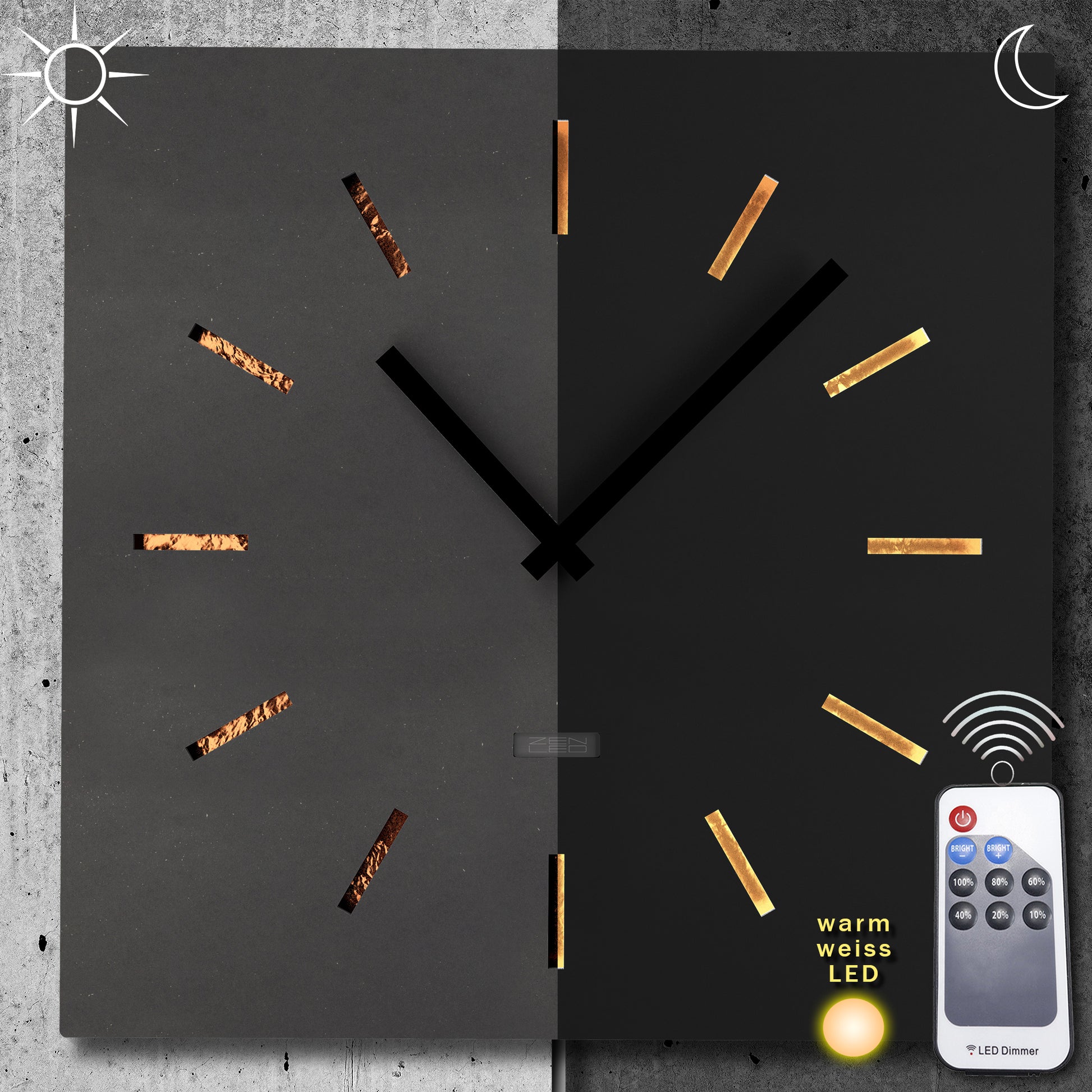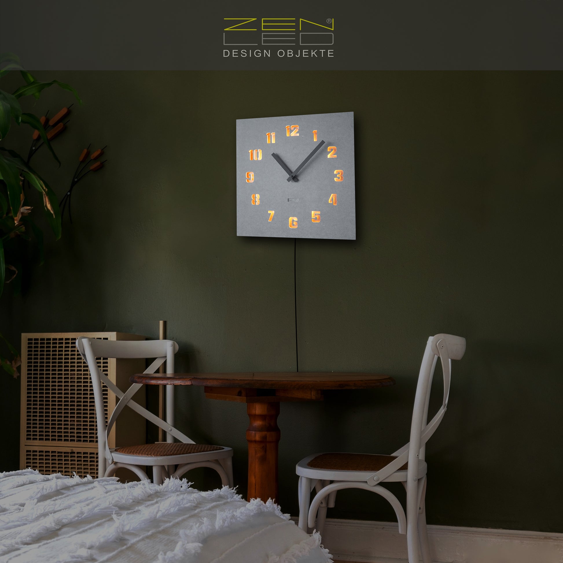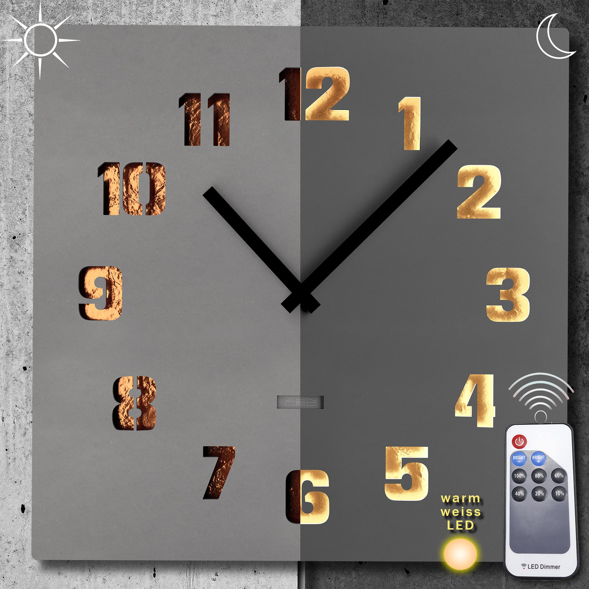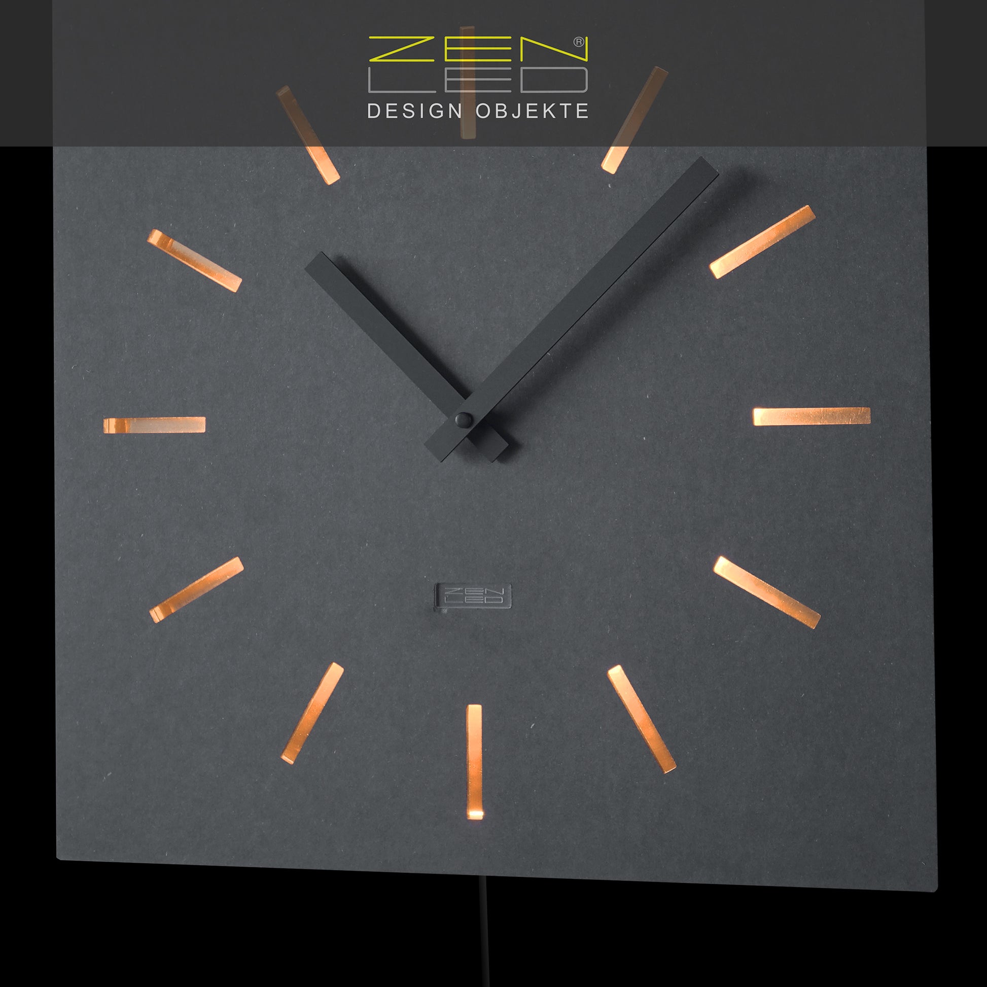 STILVOLL - Die beleuchtete Wanduhr in der Größe ECKIG XL 40x40cm mit einem QUADRATISCHEM Ziffernblatt aus durchtränktem original FORESCOLOR MDF in ANTHRAZIT-SCHWARZ oder BETON-GRAU, in den Design-Varianten mit ausgehöhlten Arabischen ZAHLEN oder Stundenmarkierungen, die mit KUPFER Metall-Plättchen ausgelegt und mit den eingebauten WARM-WEISSEN LEDs elegant ausgeleuchtet werden.