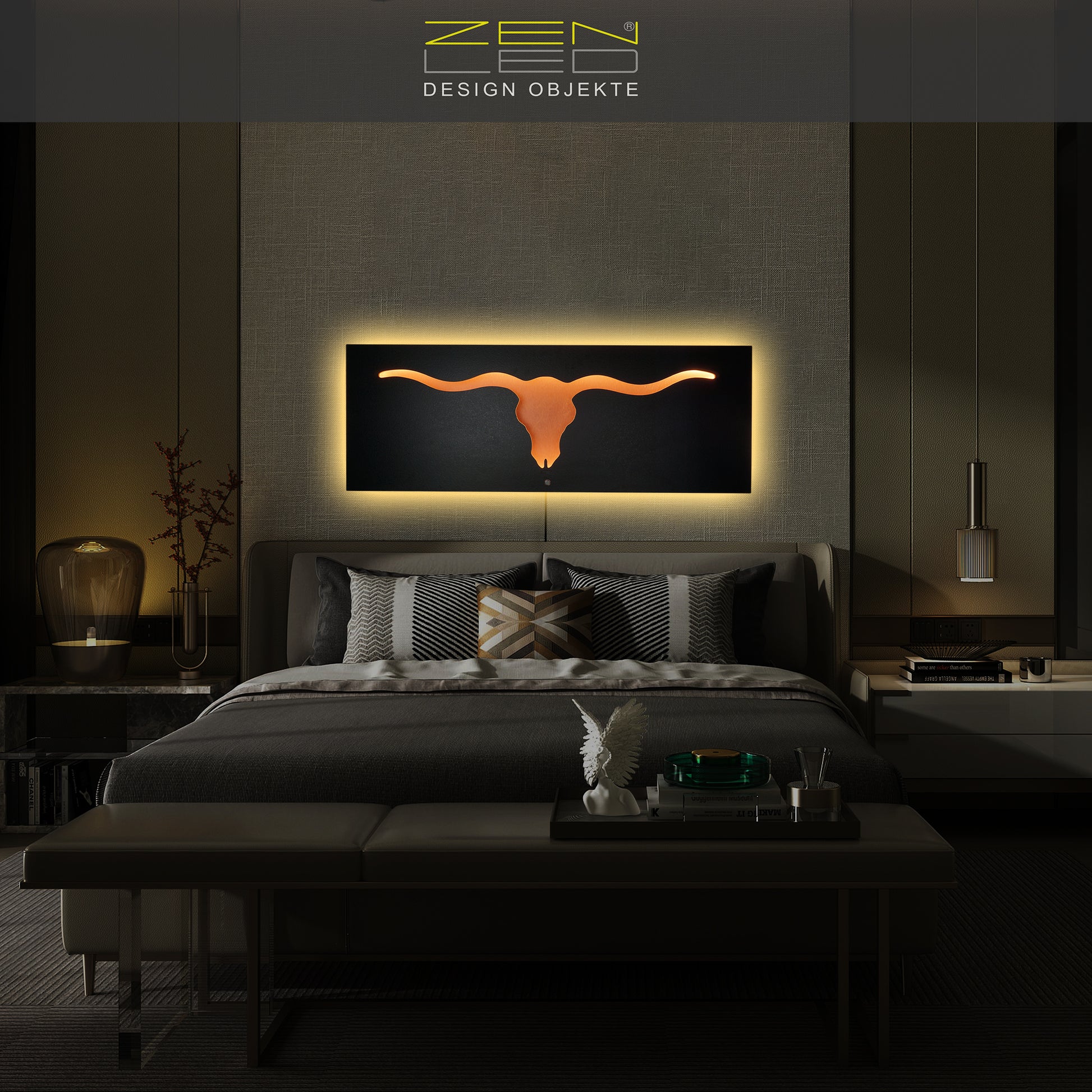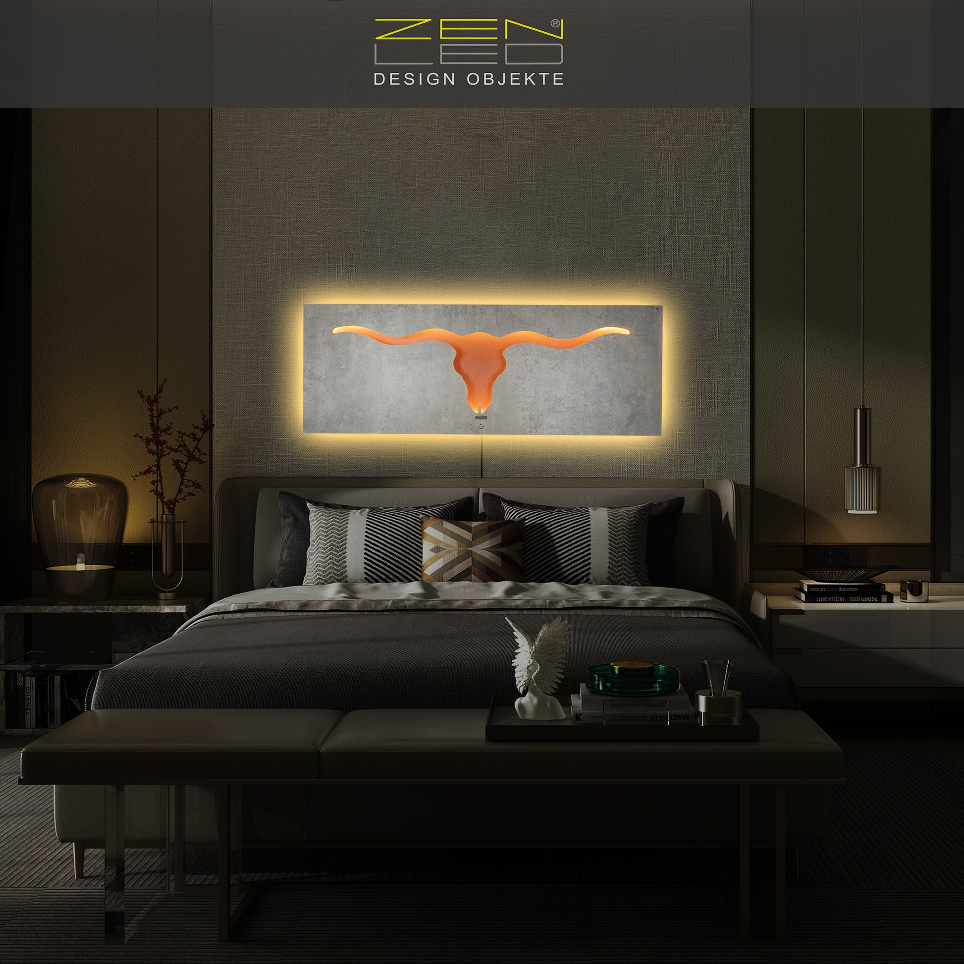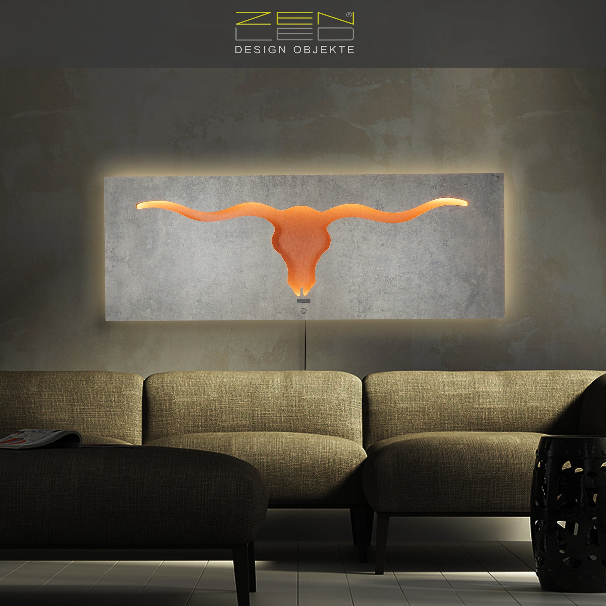 EDLER BLICKFANG - Das warm-weiß hinterleuchtete Longhorn Stier-Motiv in natürlicher Stein Optik mit Metall Rückplatte wird zum eleganten Deko Highlight - ein beeindruckender Blickfang für Wohn-, Flur & Schlaf-Zimmer.
